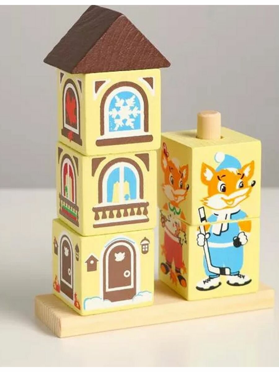 Развивающий набор "Лисенок" предлагает собрать из кубиков на палочке веселого рыжего плутишку и его домик. На 2 кубиках изображен озорной лисенок в разноцветных костюмчиках, соответствующих временам года, 3 другие кубика позволяют собрать норку для лисенка. Треугольный кубик - крыша домика. Можно предложить малышу собрать все кубики так, чтобы картинки совпали друг с другом (ориентируясь на одежку плутишки).