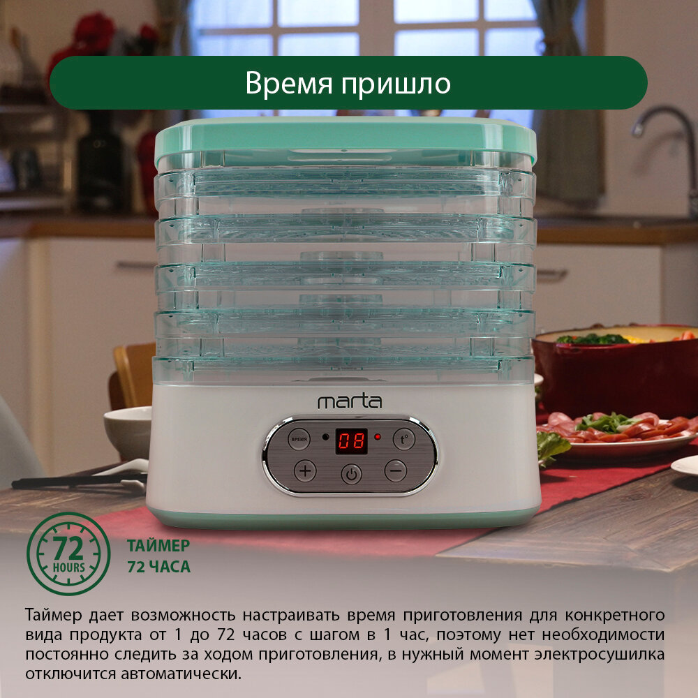 Универсальная сушилка для овощей и фруктов Marta с удобным электронным управлением станет настоящим помощником на вашей кухне. Вместительные пластиковые секции удобно регулируются по высоте, позволяя одновременно сушить большое количество различных продуктов, без соприкосновения друг с другом. Встроенный вентилятор для улучшенной циркуляции воздуха, обеспечивает равномерную сушку продуктов с сохранением их вкусовых качеств и полезных веществ. Таймер с функцией автоматического отключения гарантирует безопасное использование прибора и экономию электроэнергии.
