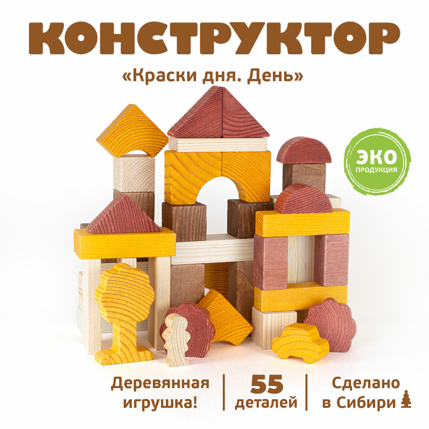 ТОМИК Краски дня. День - яркий, экологичный и увлекательный деревянный конструктор. Ребёнок будет строить домики, замки, башни, пирамиды, стеночки, арки. Пространственное мышление, фантазия, умение использовать форму предмета - всё это использует ребёнок, придумывая собственную игру с кубиками. Кроме того, подобная строительная активность развивает мелкую моторику рук, координацию, воображение, приучает ребенка к усидчивости, собранности и аккуратности. Деревянный конструктор - удобный дидактический материал. Разноцветные детали помогают ребенку не только выучить называния цветов и геометрических плоских и объёмных фигур, но и понятия больше-меньше, выше-ниже, шире-уже. Деревянные строительные конструкторы включают в себя набор деревянных блоков самых разнообразных форм: кубики, плитки, треугольники, параллелепипеды, разной длины цилиндры и другие фигуры. Блоки деревянного строительного конструктора универсальны и могут дополнить другие наборы. Все детали конструктора окрашены в яркие цвета - желтые, красные, зеленые, синие, белые и неокрашенные. Детали конструктора изготовлены из экологически чистого, прочного материала - древесины хвойных пород. Они достаточно плотны, что очень облегчает игру, и стойки к повреждениям и износу - детали конструктора будут служить малышу много лет. Как и вся продукция ТОМИК, все составляющие детали сертифицированы для малышей, а красящие составы долговечны и надёжны.