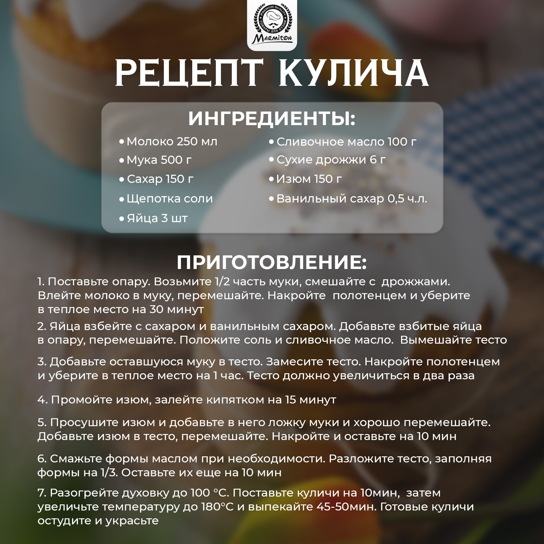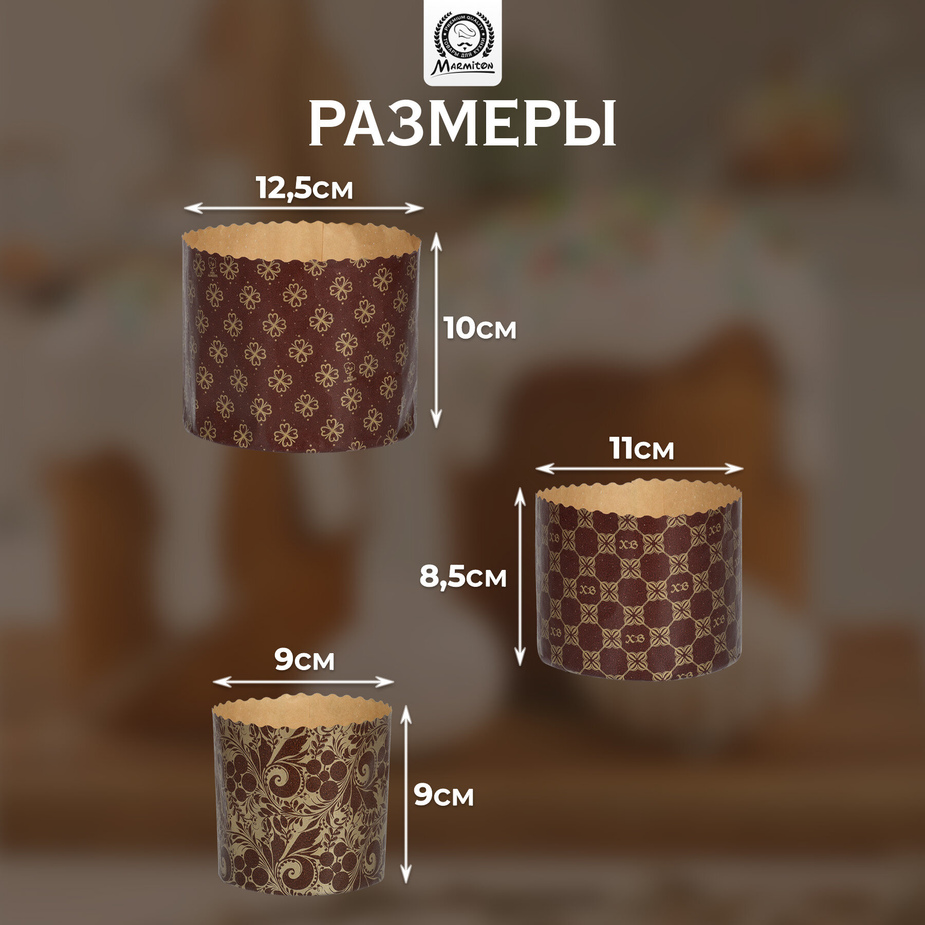 Основные преимущества использования бумажных форм является отсутствие необходимости мыть формы после использования, смазывать их маслом, а также высокое качество изделий, выпекающихся в таких формах из бумаги. Одноразовые бумажные формы для выпечки пасхальных куличей , кексов, маффинов и т. д. В пасхальный набор входят формы размерами: d 9*9 см (0,5 л), d 11*8,5 см (1 л), d 12,5*10 см (1,25 л). Три дизайна в ассортименте.Используются при температуре до 220°С.Состав: пергамент пищевой.Срок годности: не ограничен.Условия хранения: хранить в сухом прохладном месте. Не подвергать прямому воздействию огня.Температурный режим: нет.