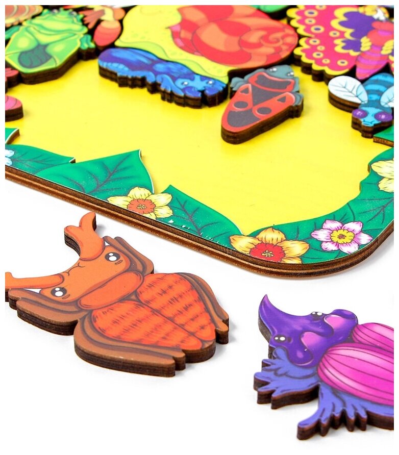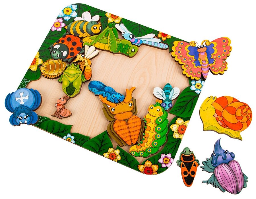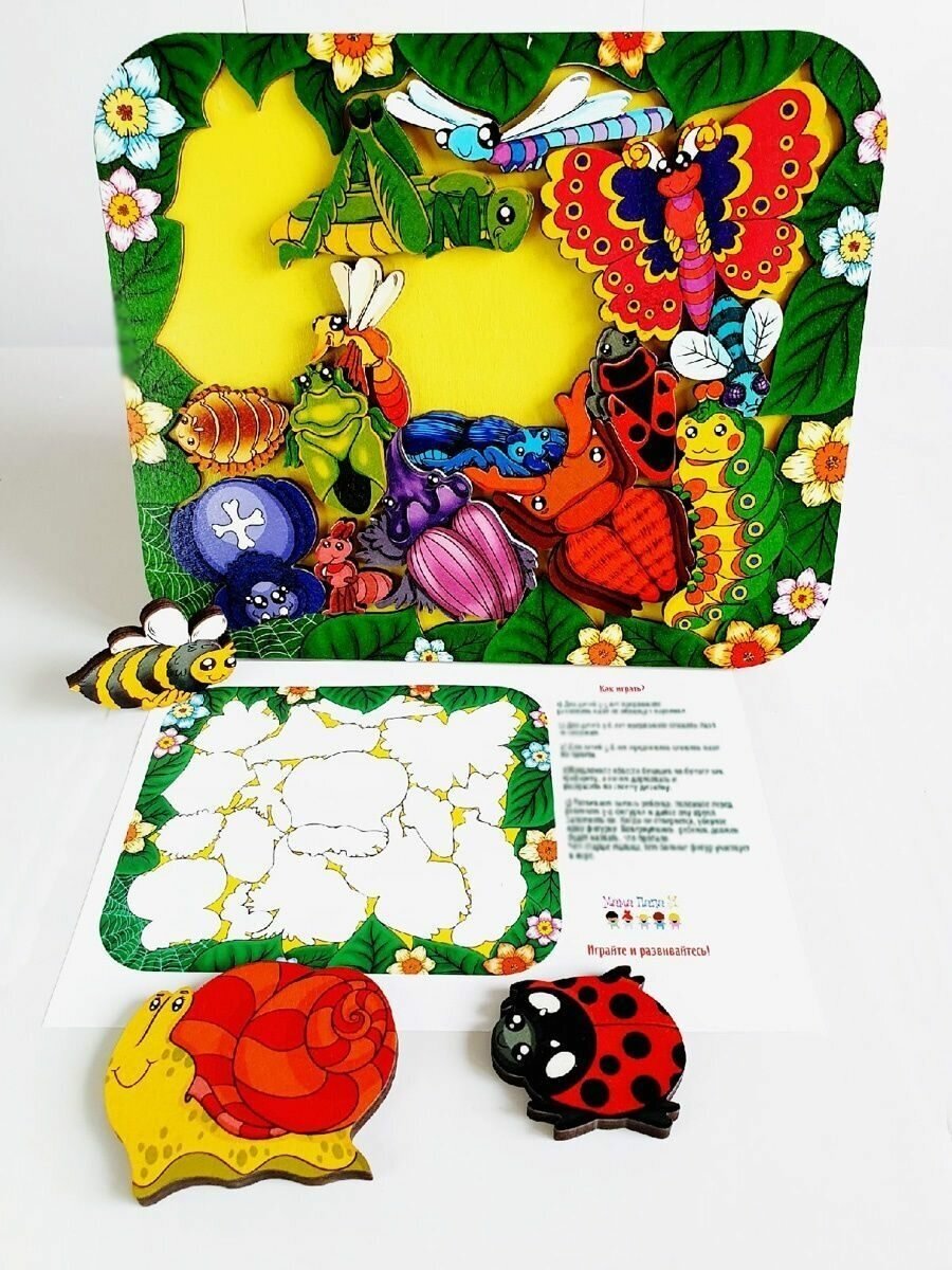 В наборе 17 фигурок насекомых, которые нужно расположить на поле. На входящем в набор вкладыше приведена картинка укладки фигурок. Сначала можно предложить ребенку собирать пазл по образцу, а затем по памяти.