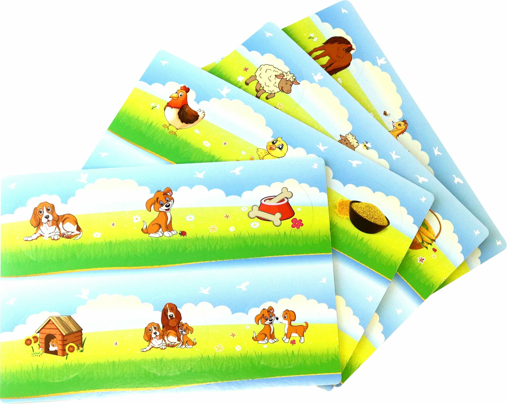 В наборе 8 карточек с выдавливающимися картинками. На картинках домашние животные, их детеныши и то, чем они питаются.