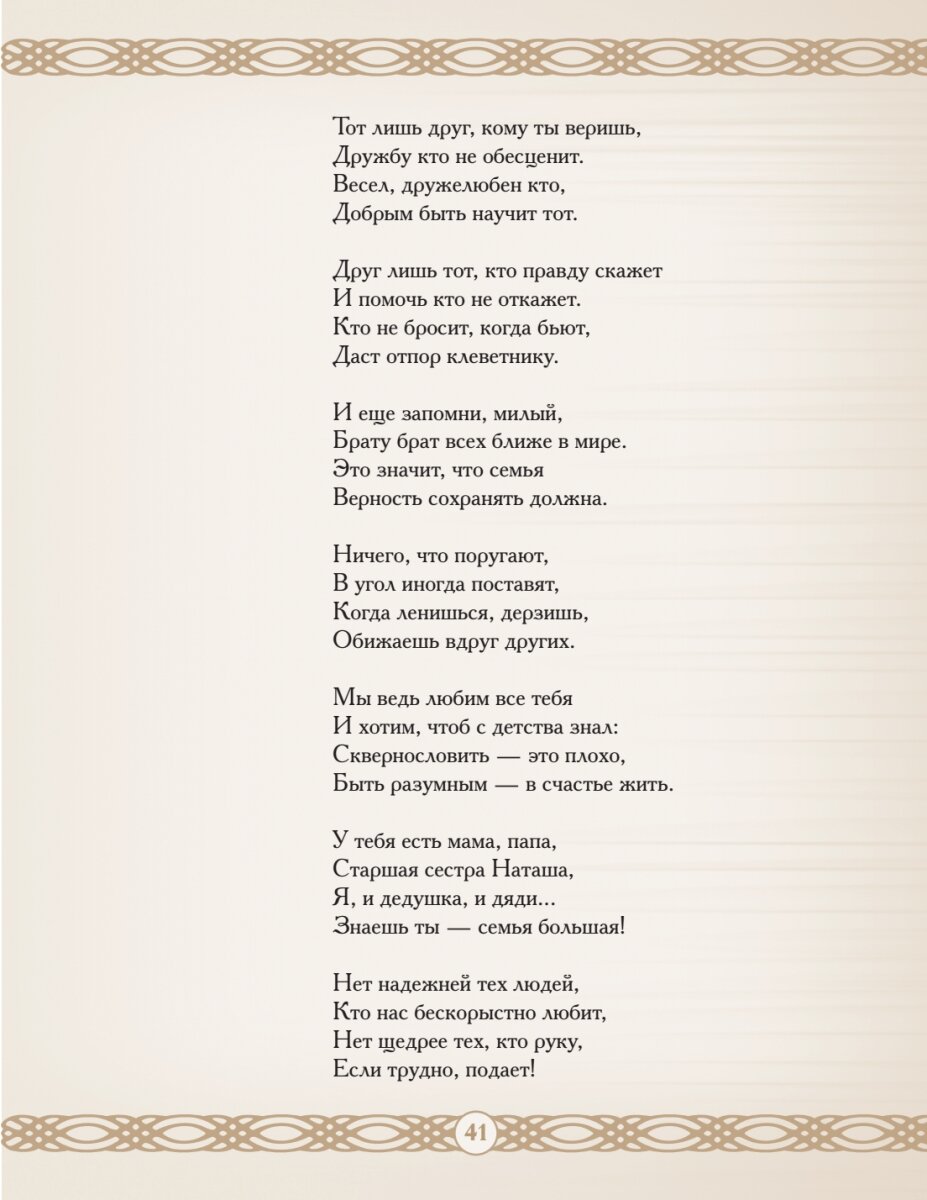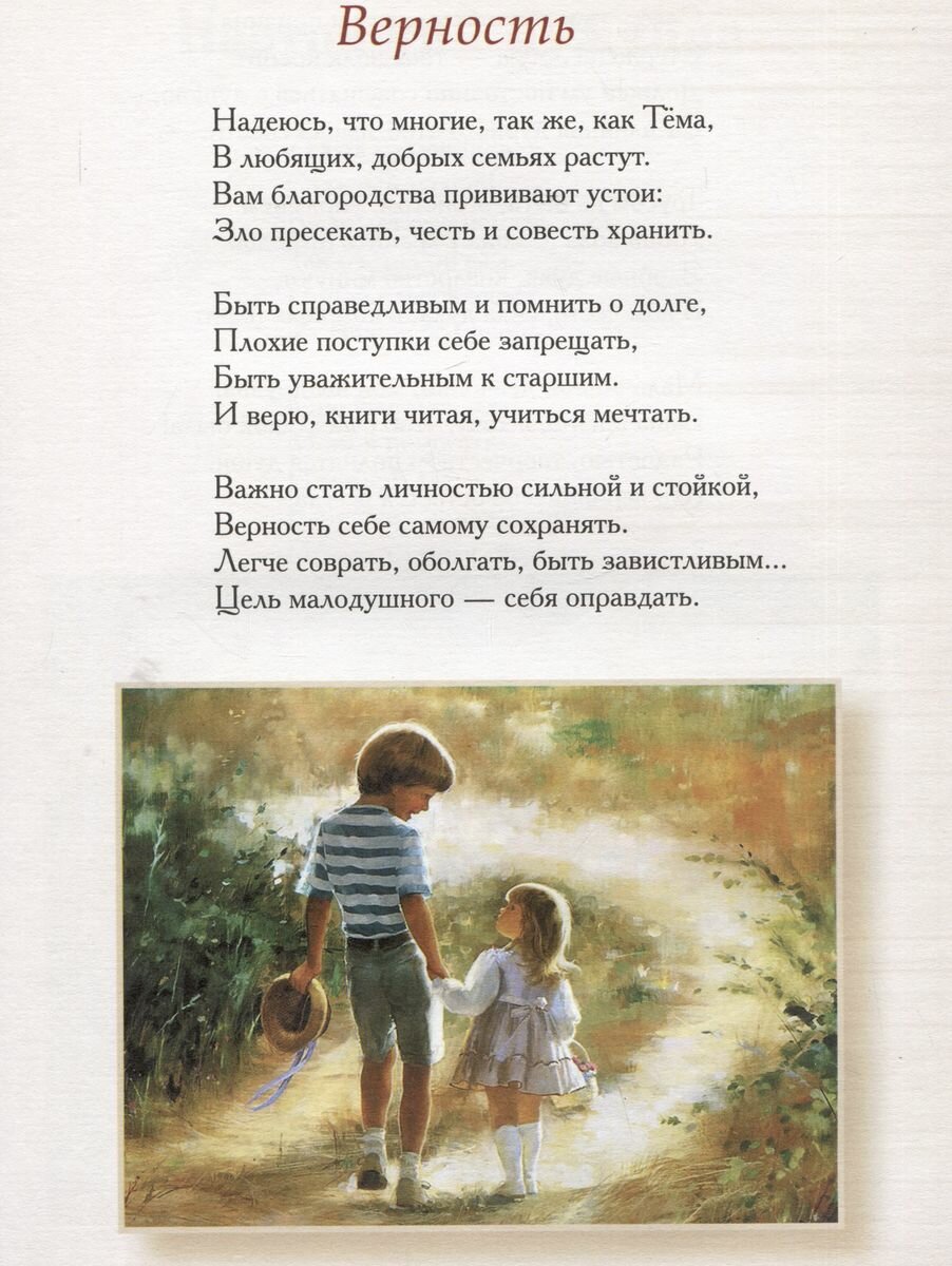 Цель стихотворных повествований книги - напомнить о почти забытых понятиях, которые в высочайшей степени ценились в русском обществе, - Чести и Верности. Напомнить, в каких словосочетаниях эти слова употреблялись: Честь Родины и Верность Родине, а также Честь семьи и Верность семье. Эти стихи учат высоко оценивать такие качества человека, как ответственность, смелость, честность, трудолюбие и любознательность. Автор рекомендует читать эту книгу родителям, бабушкам и дедушкам, учителям и наставникам вместе с детьми и подростками.