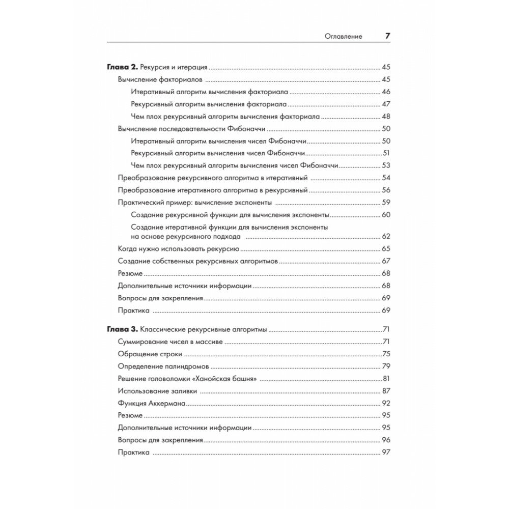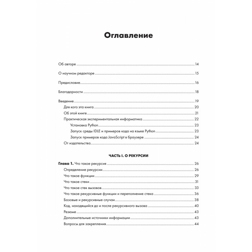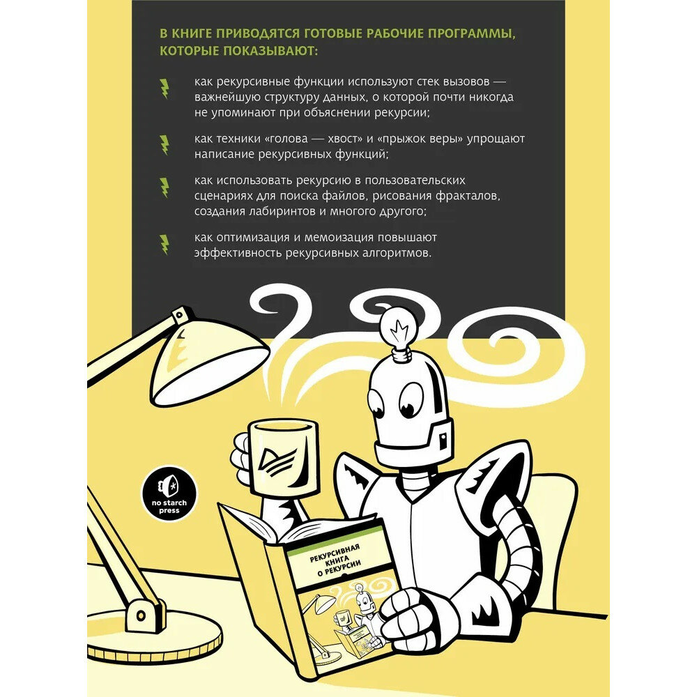 Книга "Рекурсивная книга о рекурсии" содержит примеры кода на языке Python и JavaScript, которые иллюстрируют основы рекурсии и проясняют фундаментальные принципы всех рекурсивных алгоритмов. Из книги вы узнаете о том, когда стоит использовать рекурсивные функции (и, главное, когда этого не нужно делать), как реализовывать классические рекурсивные алгоритмы, часто обсуждаемые на собеседованиях, а также о том, как рекурсивные методы помогают решать задачи, связанные с обходом дерева, комбинаторикой и другими сложными темами.