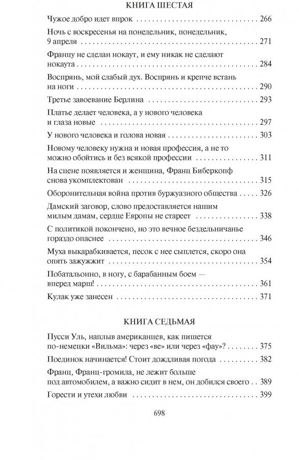 Безусловно, роман значимый и сложносочинённый - Деблин применяет массу интересных приемов, в числе коих кинематографический, события, происходящие с героем монтируются, как кадры кинофильма и воспринимаются в процессе чтения соответственно. Сюжетно текст также занимателен. Деблин повествует о злоключениях некоего Франца Биберкопфа, которые, собственно, и являют собой его жизнь, больше похожую на череду падений. С точки зрения оформления книга неплоха, единственный недостаток - газетная бумага.