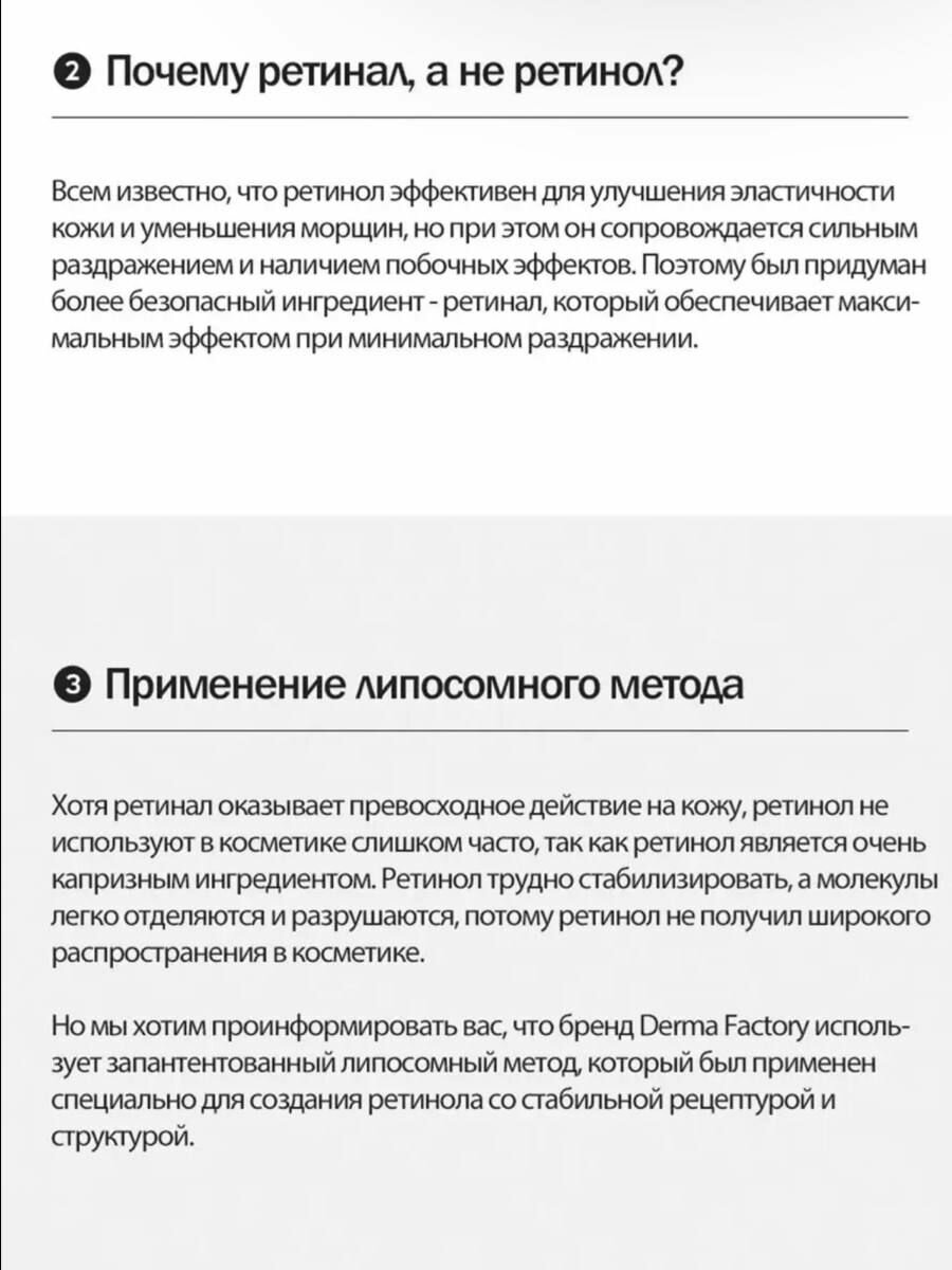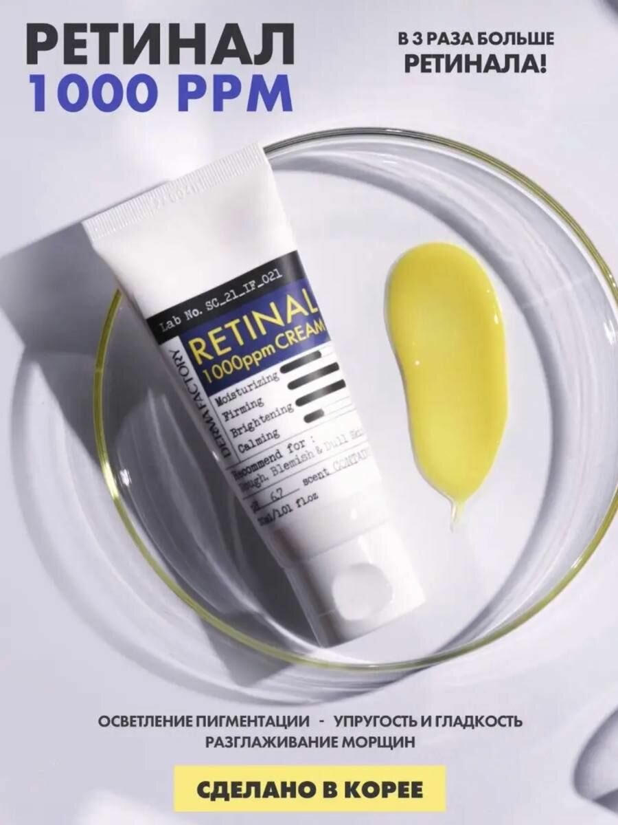| Способ применения | Рекомендуется использовать только на ночь, а если есть раздражение кожи во время начального периода адаптации, использовать крем через день или 3 дня. Для оптимального эффекта рекомендуется использовать в течение 6 месяцев после вскрытия. При одновременном применении с косметикой, содержащей витамин С, он может вызвать раздражение, поэтому, пожалуйста, по возможности избегайте их одновременного использования. — Если вы впервые используете средство с ингредиентом Retinal, вам понадобится период адаптации. Сначала используйте крем Retinal 300 ppm. При адаптации вашей кожи или немедленном использовании крема Retinal 1000 ppm обязательно используйте небольшое количество и постепенно увеличивайте.— В период адаптации покалывание, покраснение и шелушение — естественные реакции на обновление кожи.— Раздражение слабое, но в случае с чувствительной кожей она может покраснеть и шелушиться в самом начале использования, что является нормальной реакцией. Если вначале появляется раздражение, рекомендуется использовать крем в небольших количествах через день или один раз в 3 дня для адаптации к коже. Если у вас очень чувствительная кожа, рекомендуется нанести небольшое количество на запястье или за ухом, протестировать и использовать, если нет проблем. Если раздражение не проходит, прекратите использование и обратитесь к врачу.— Не используйте одновременно со скрабами и пилингами. Следует воздержаться от одновременного использования косметических аппаратов и процедур. — Не рекомендуется использовать беременным или кормящим грудью. — Крем для ночного ухода с ретиналом может сделать вашу кожу более чувствительной к УФ-излучению. Рекомендуется использовать на ночь, утром обязательно нанесите солнцезащитный крем с SPF 30 или выше. |