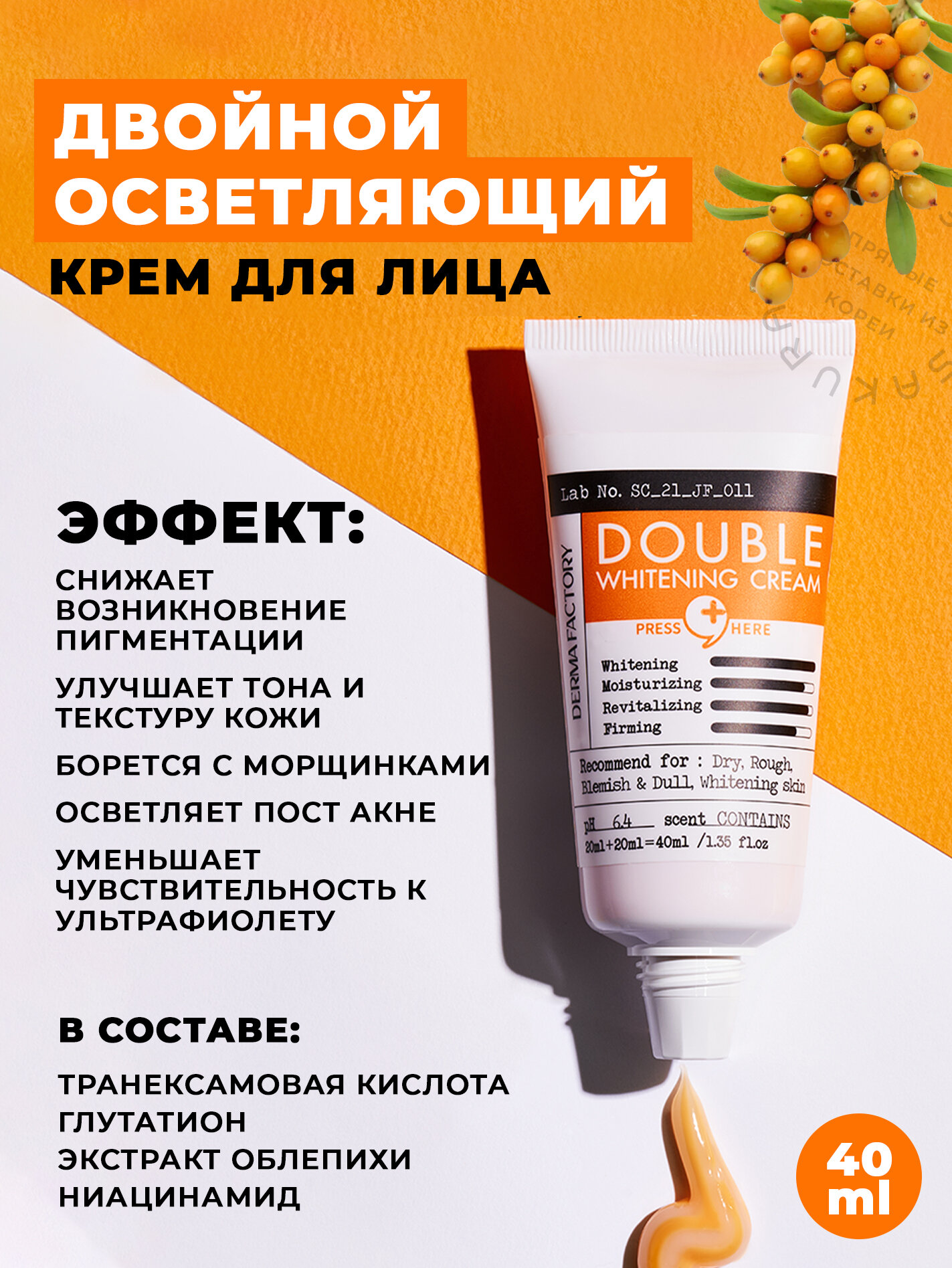 | Активные компоненты | витамин B3 (ниацинамид), глутатион, транексамовая кислота, экстракт облепихи |