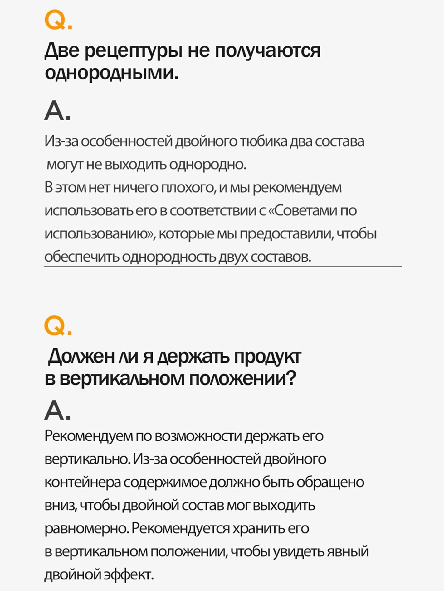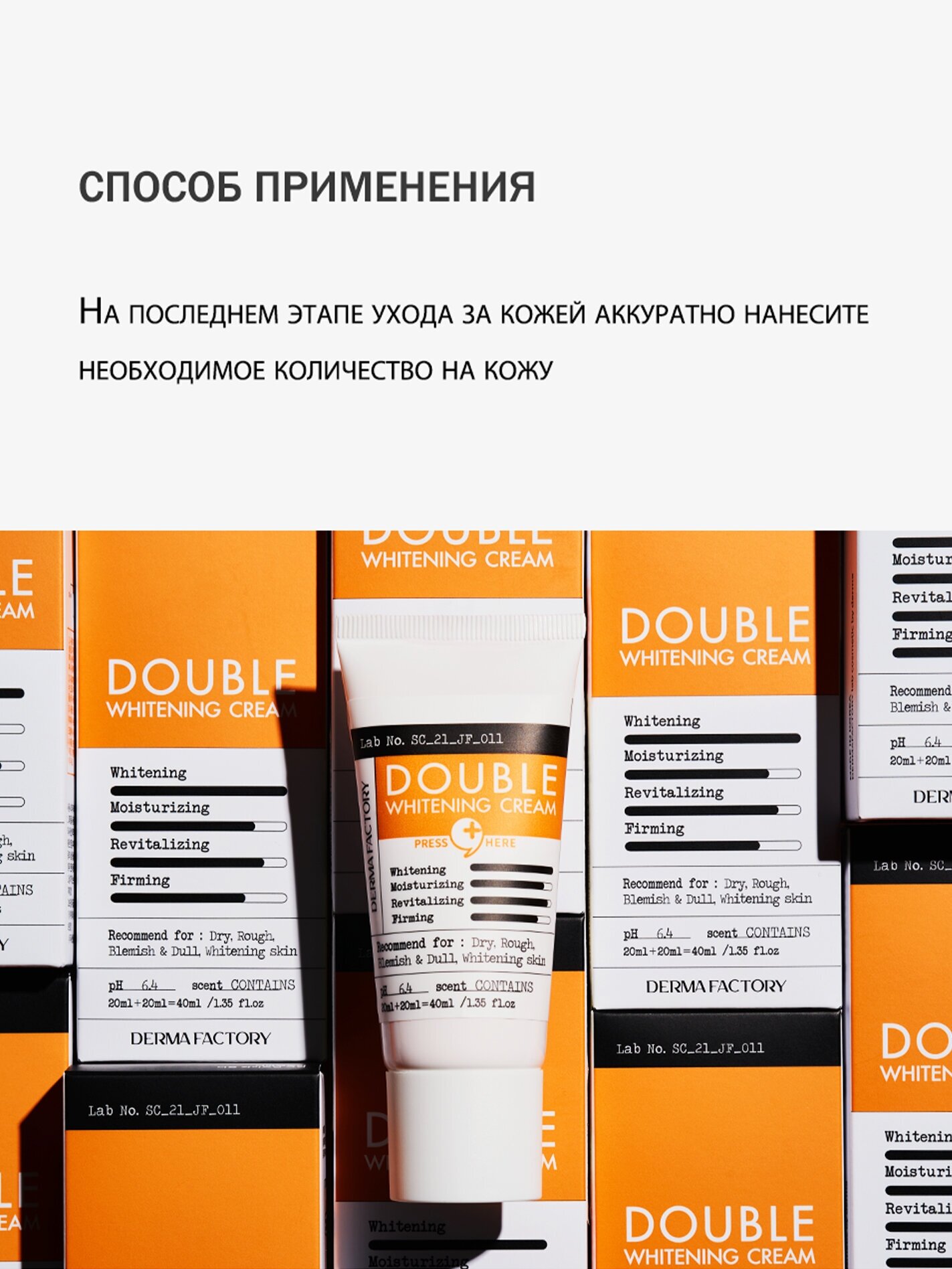 | Способ применения | — На последнем этапе ухода за кожей аккуратно нанесите необходимое количество на кожу. — Перед использованием закройте крышку и несколько раз постучите по ней ладонью, крышкой вниз. — Нажмите PRESS HERE (или ниже) контейнера, чтобы двойной состав мог выходить равномерно. В зависимости от оставшегося количества содержимого постепенно регулируйте положение нажатия от положения PRESS HERE вниз. — Иногда из-за характеристик контейнера может получиться только один цвет, но это не означает, что с продуктом возникла проблема. Рекомендуется следовать советам по применению, чтобы получить двойной состав. |