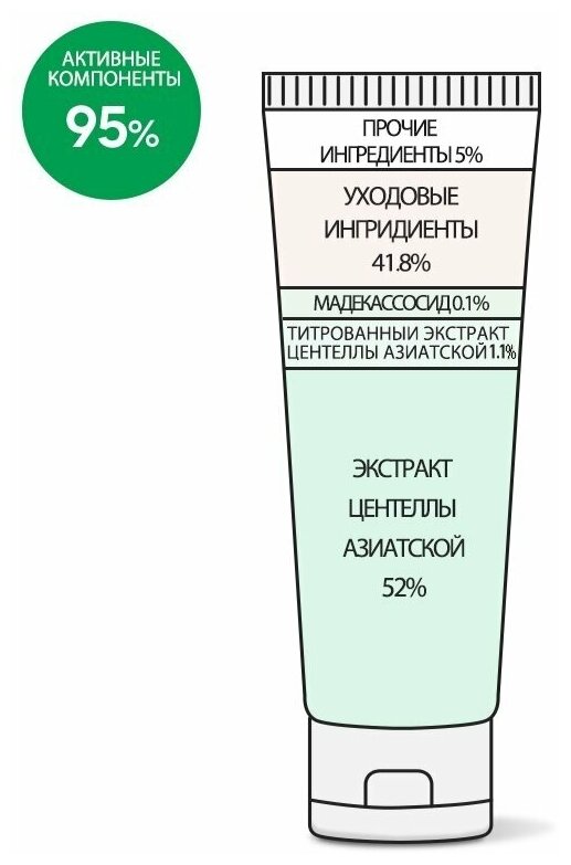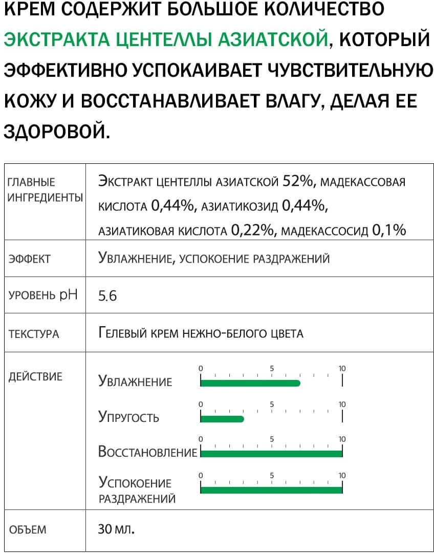 | Состав | Centella Asiatica Extract 52.2%, Dipropylene Glycol 30.0%, Butylene Glycol 3.0%, Hydrogenated Poly (C6-14 Olefin) 3.0%, Pentaerythrityl Tetraethylhexanoate 3.0%, 1.2-Hexanediol 2.0%, Caprylic/Capric Triglycerides 2.0%, Madecasic Acid 0.4%, Asiaticoside 0.4%, Asiatic Acid 0.2%, Madecassoside 0.1%, Hydroxyethyl Acrylate/Sodium Acryloyldimethyl Taurate Copolymer, Cetearyl Olivate, Sorbitan Sesquioleate, Cetearyl Alcohol, Sorbitan Oliveate, Polyglyceryl-3 Distearate, Sorbitan Isostearate, Xanthan Gum, Glyceryl Stearate Citrate, Ethylhexylglycerin, Purified water |