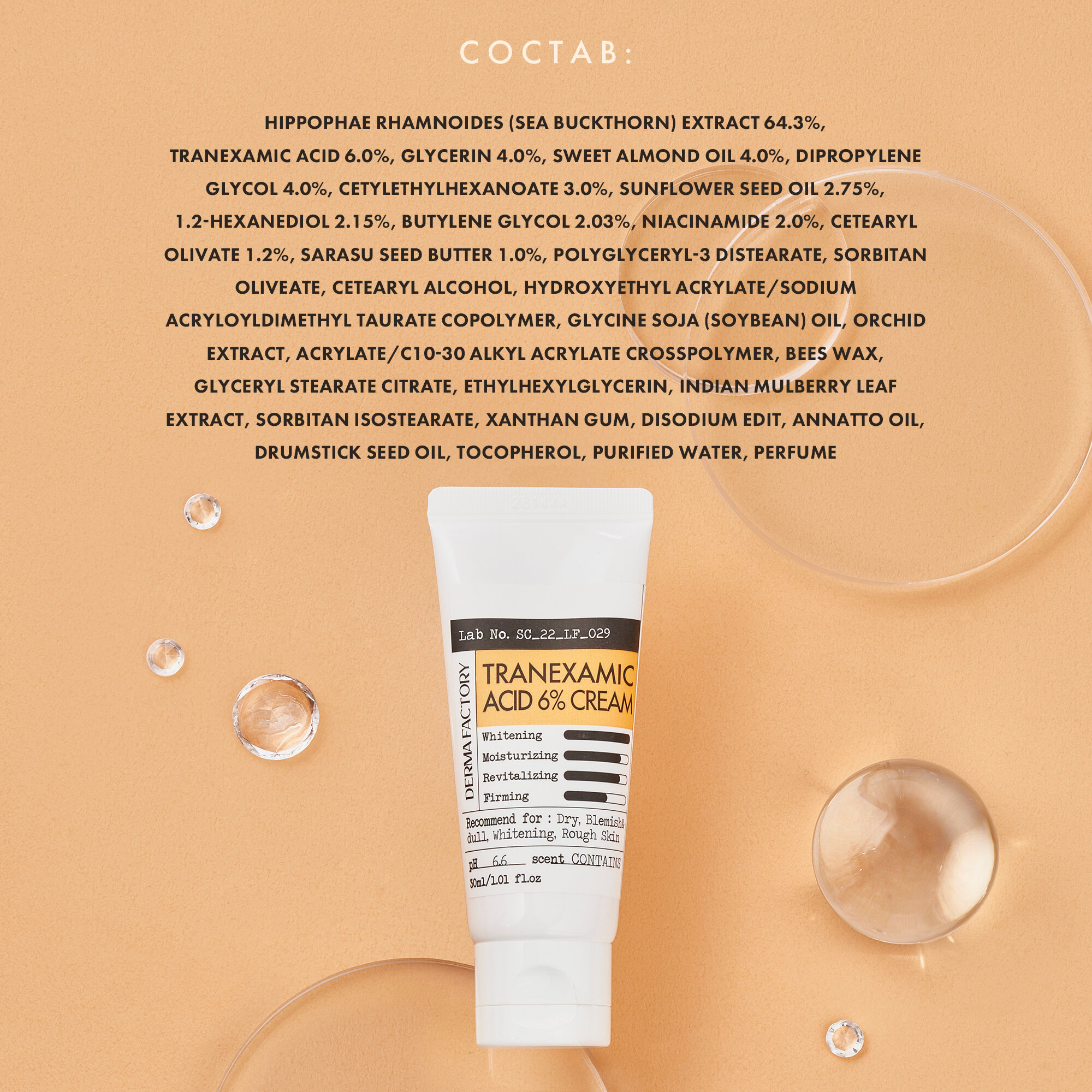 | Состав | Hippophae Rhamnoides (Sea Buckthorn) Extract 64.3%, Tranexamic Acid 6.0%, Glycerin 4.0%, Sweet Almond Oil 4.0%, Dipropylene Glycol 4.0%, Cetylethylhexanoate 3.0%, Sunflower Seed Oil 2.75%, 1.2-Hexanediol 2.15%, Butylene Glycol 2.03%, Niacinamide 2.0%, Cetearyl Olivate 1.2%, Sarasu Seed Butter 1.0%, Polyglyceryl-3 Distearate, Sorbitan Oliveate, Cetearyl Alcohol, Hydroxyethyl Acrylate/Sodium Acryloyldimethyl Taurate Copolymer, Glycine Soja (Soybean) Oil, Orchid Extract, Acrylate/C10-30 Alkyl Acrylate Crosspolymer, Bees Wax, Glyceryl Stearate Citrate, Ethylhexylglycerin, Indian Mulberry Leaf Extract, Sorbitan Isostearate, Xanthan Gum, Disodium EDIT, Annatto Oil, Drumstick Seed Oil, Tocopherol, Purified water, Perfume |