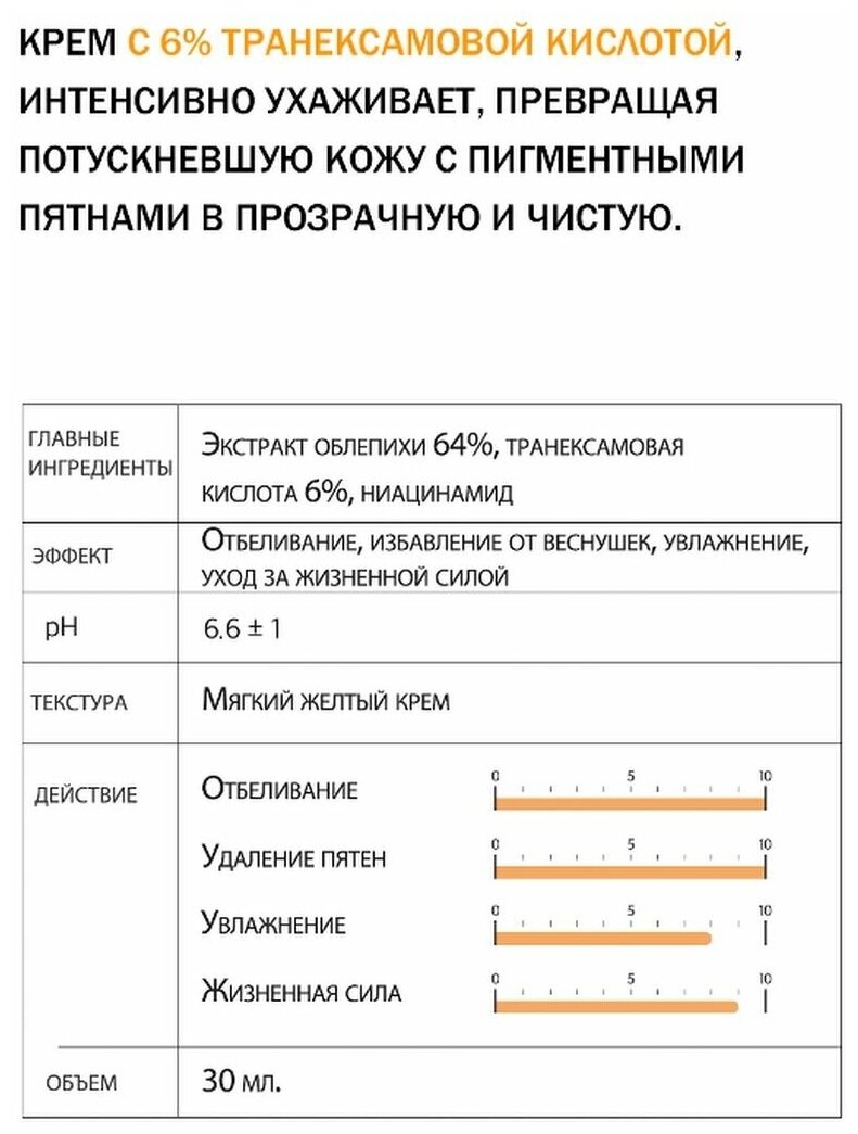 | Активные компоненты | экстракт облепихи, транексамовая кислота, масло сладкого миндаля, масло подсолнечника, ниацинамид (витамин B3), глицерин, токоферол |