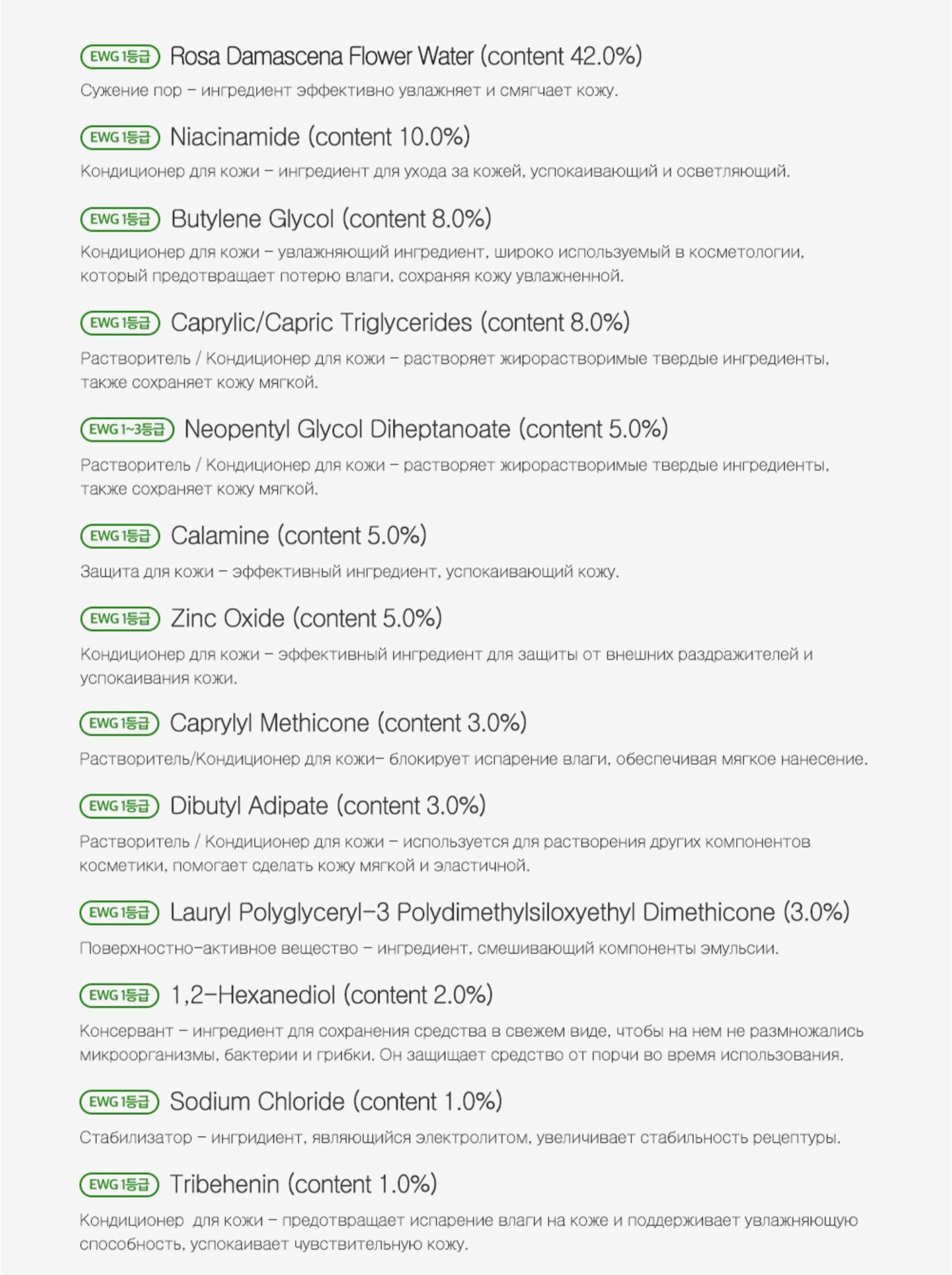 | Состав | Rosa Damascena Flower Water 42.0%, Niacinamide 10.0%, Butylene Glycol 8.0%, Caprylic/Capric Triglycerides 8.0%, Neopentyl Glycol Diheptanoate 5.0%, Calamine 5.0%, Zinc Oxide 5.0%, Caprylyl Methicone 3.0%, Dibutyl Adipate 3.0%, Lauryl Polyglyceryl-3 Polydimethylsiloxyethyl Dimethicone 3.0%, 1.2-Hexanediol 2.0%, Sodium Chloride 1.0% , Tribehenin 1.0%, Disteadymonium Hectorite, C30-45 Alkyl Cetearyl Dimethicone, Crosspolymer, Sorbitan Sesquioleate, Polyhydroxystearic Acid, Triethoxycaprylylsilane, Ethylhexylglycerin, Adenosine, Disodium EDIT, Tocopherol, Purified water |