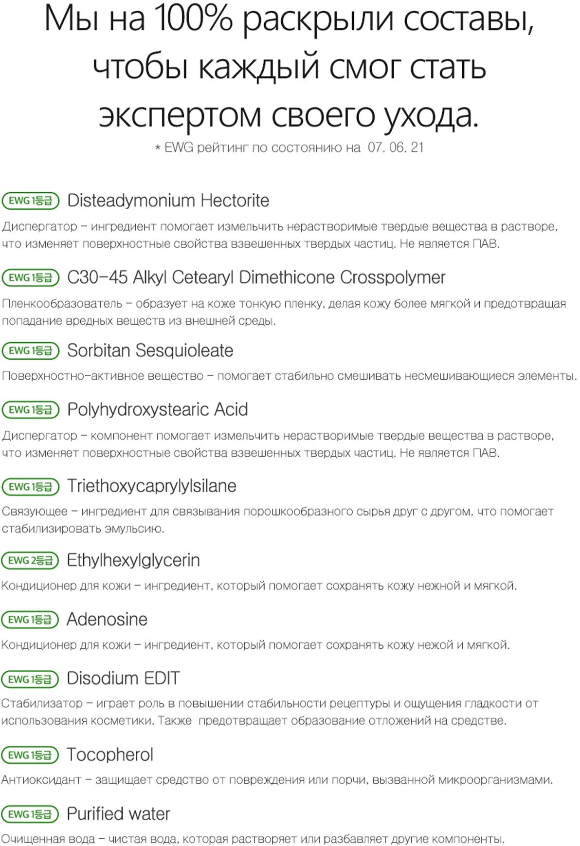 | Не содержит | без ароматизаторов, бензофенон, без искусственных консерванты, без искусственных красители, без парабенов, без силиконов, без сульфатов, без формальдегидов |