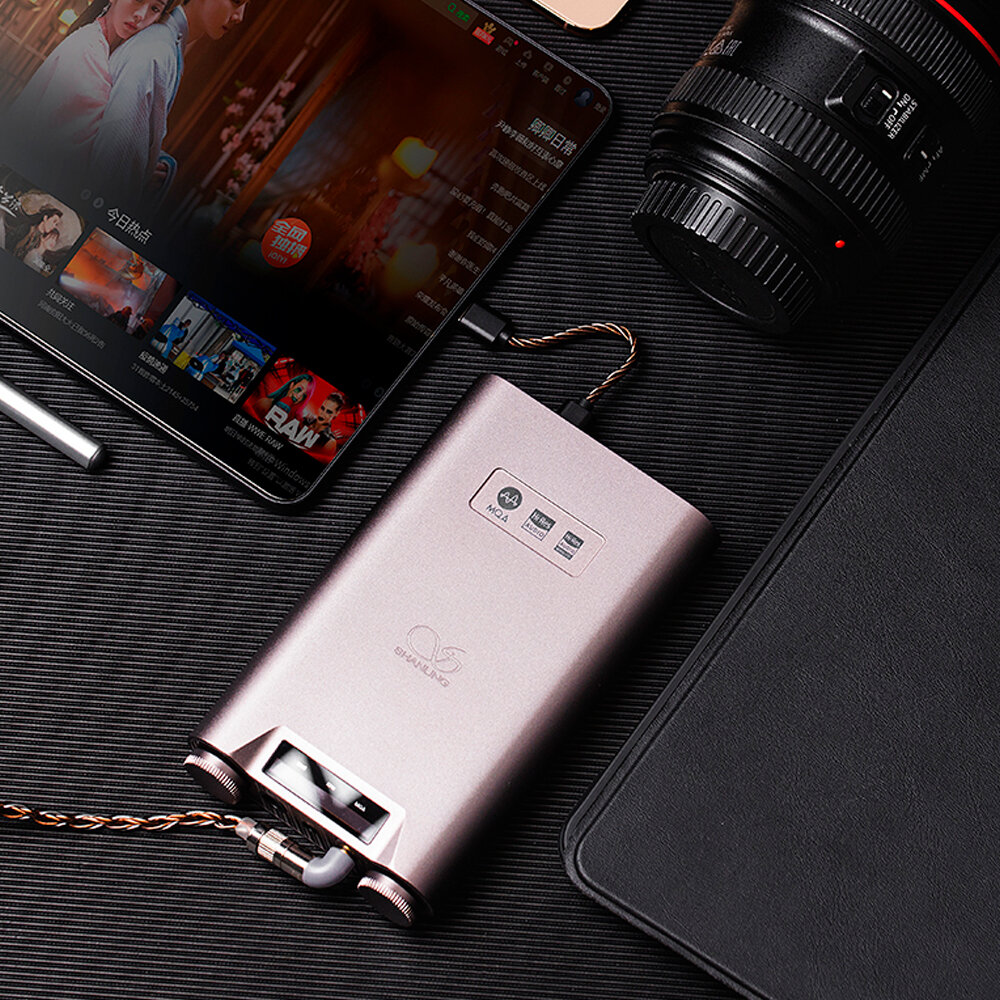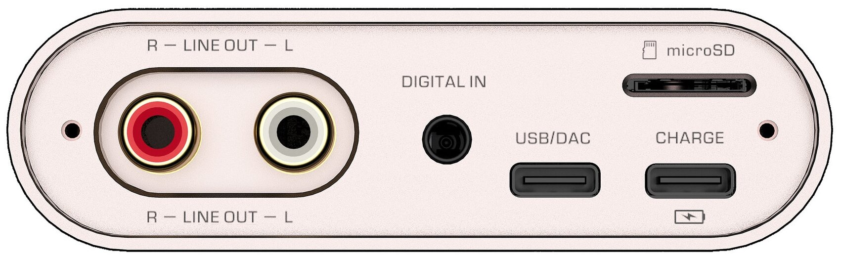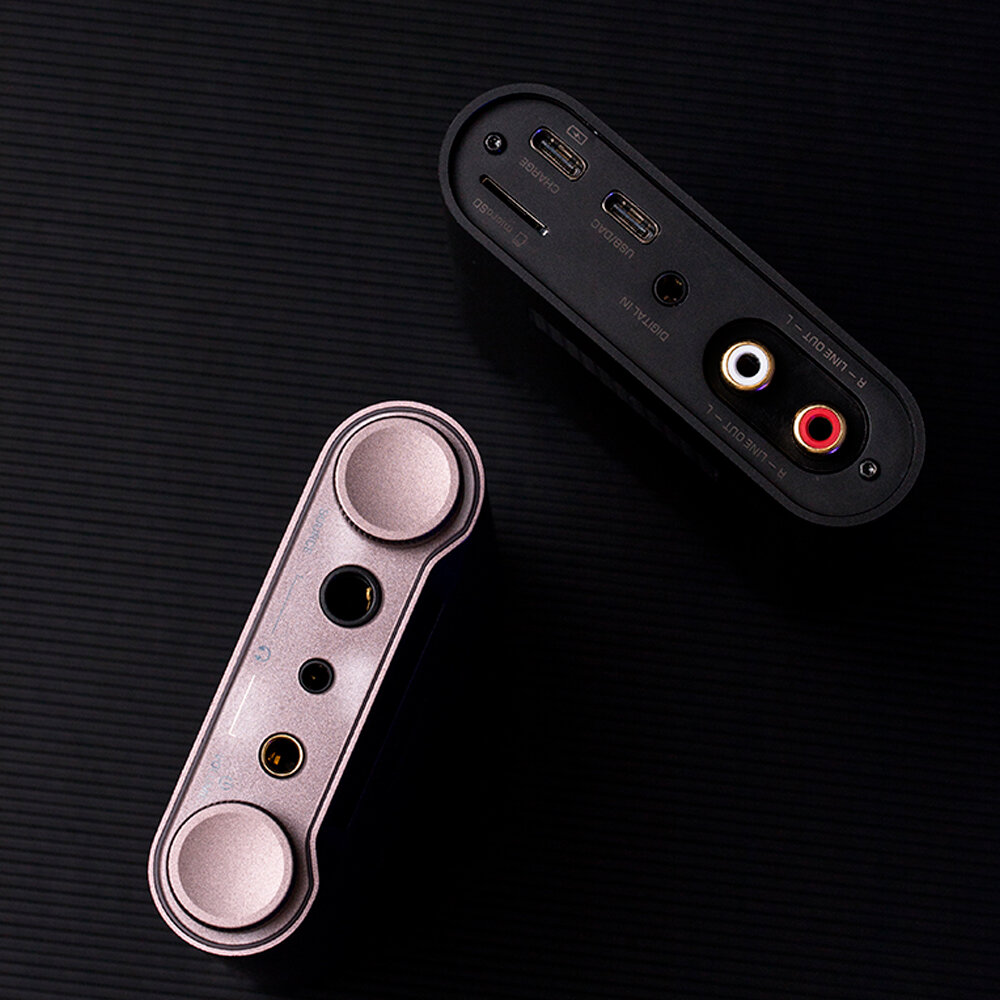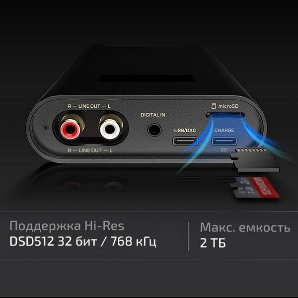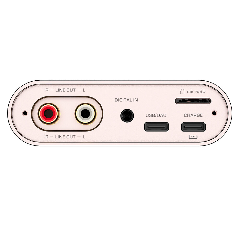 Портативный ЦАП/усилитель для наушников с дополнительным выходом на разъемах RCA. ЦАП на микросхемах AK4499EX и AK4191EQ. Воспроизведение PCM 32 бит / 786 кГц, DSD512, а также 8хMQA. Отдельный усилитель на микросхеме TPA6120A2. Входы USB-C, оптический/коаксиальный (комбинированный разъем 3,5 мм). Выходы на наушники: балансный 4,4 мм, небалансные 3,3 и 6,3 мм. Bluetooth 5.0 с c поддержкой кодеков LDAC, aptX HD и AAC. Слот для карт памяти MicroSD объемом до 2 Тб. Время автономной работы до 10 часов (небалансное подключение). Габариты (ШхВхГ): 142 x 25 x 85 мм. Вес 325 г