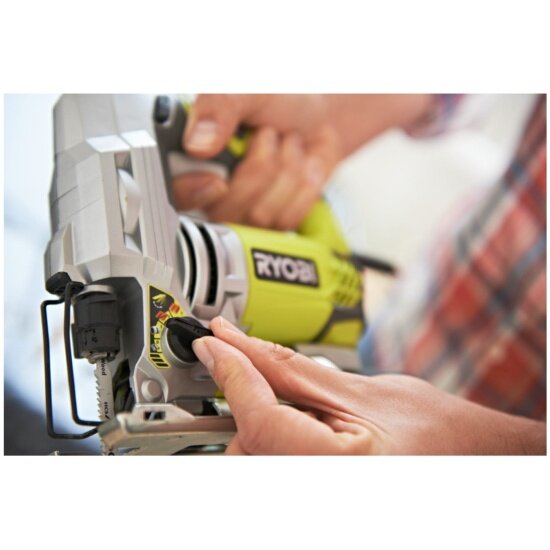 Легкий и мощный электрический лобзик Ryobi RJS850K для полупрофессиональных работ по распилу деревянных, металлических, пластиковых и резиновых материалов, с возможностью подключения к пылесосу для отвода опилок.