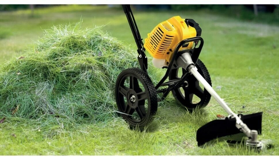 Бензиновый колесный триммер — инструмент, который предназначен для скашивания травы и мелких кустарников на приусадебных и прочих участках. Отличается высокой производительностью, хорошо справляется со скашиванием даже густой и высокой травы. Число оборотов составляет 9500±500 об/мин. В процессе работы можно использовать катушку с леской или диски типа 3Т. Катушка изготовлена из металла, имеет разборную конструкцию, что значительно упрощает ее эксплуатацию, при этом она отличается высокой надежностью и ударопрочностью.