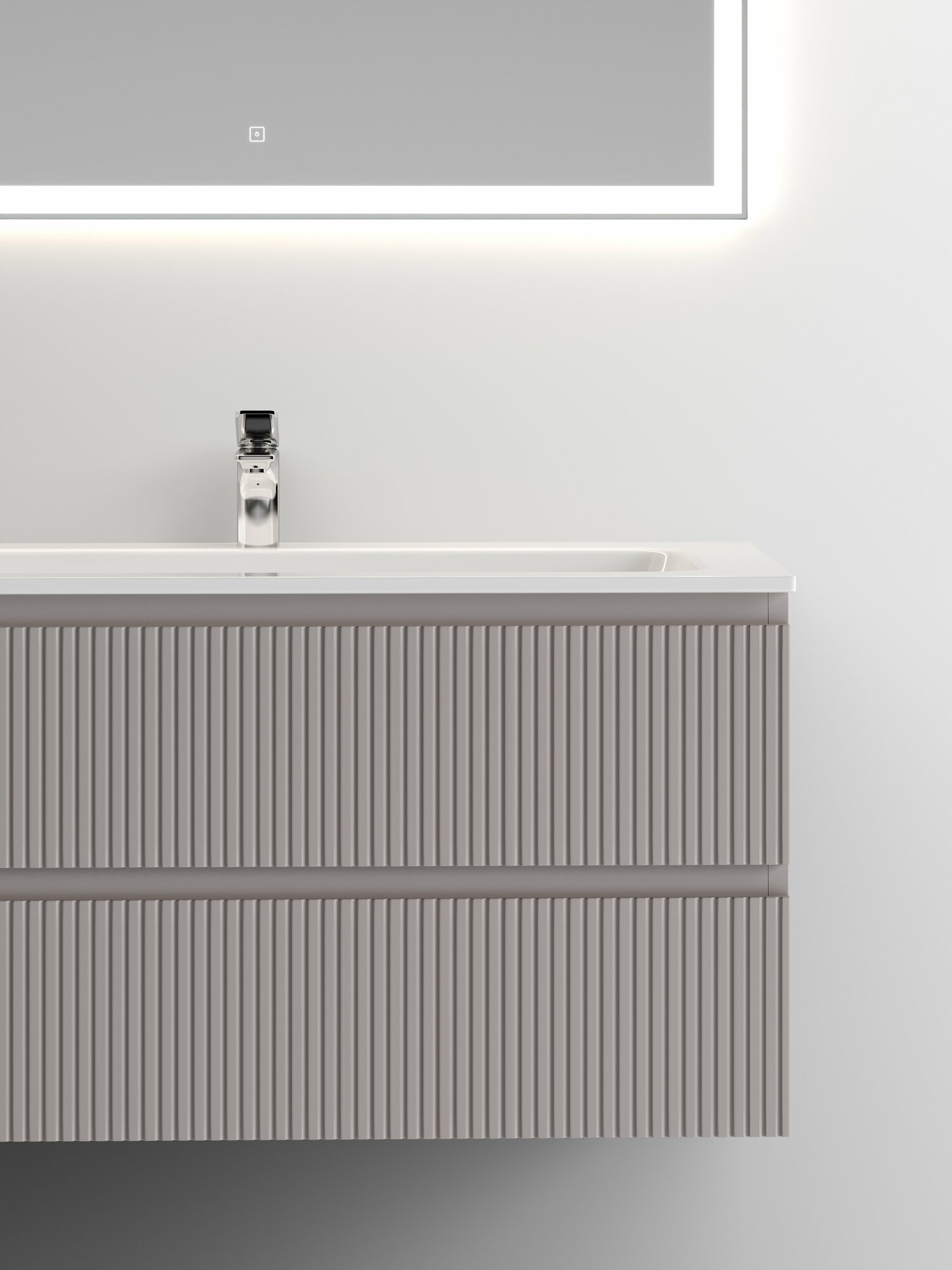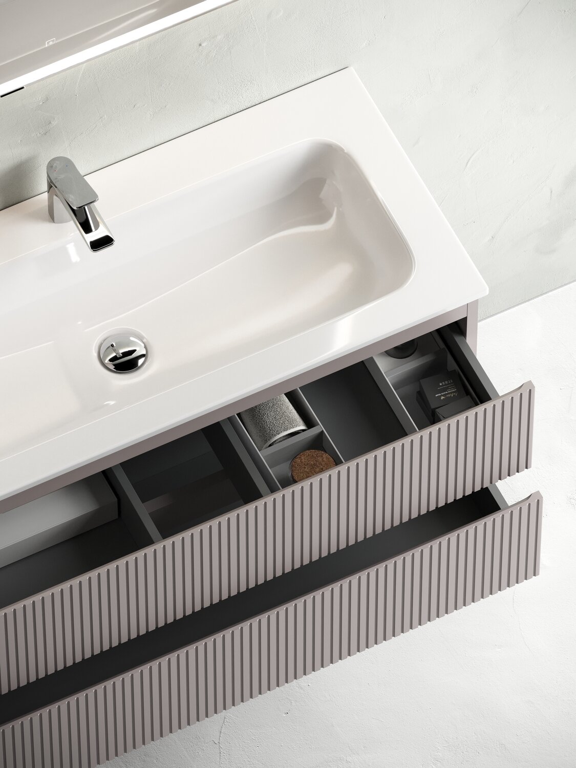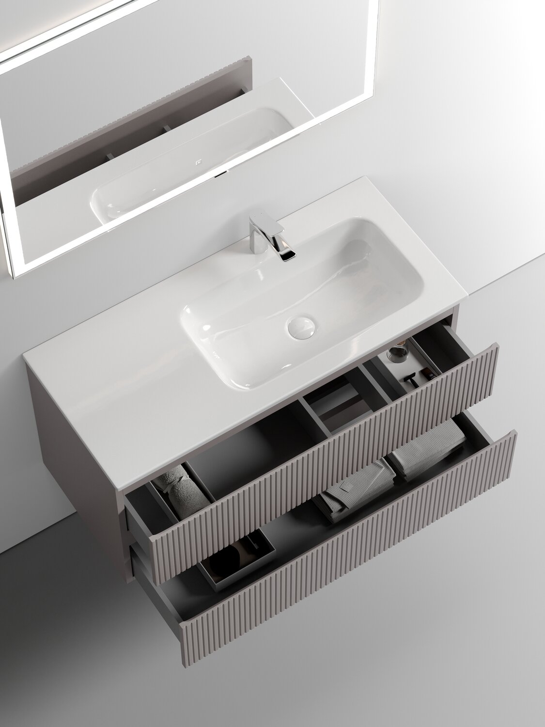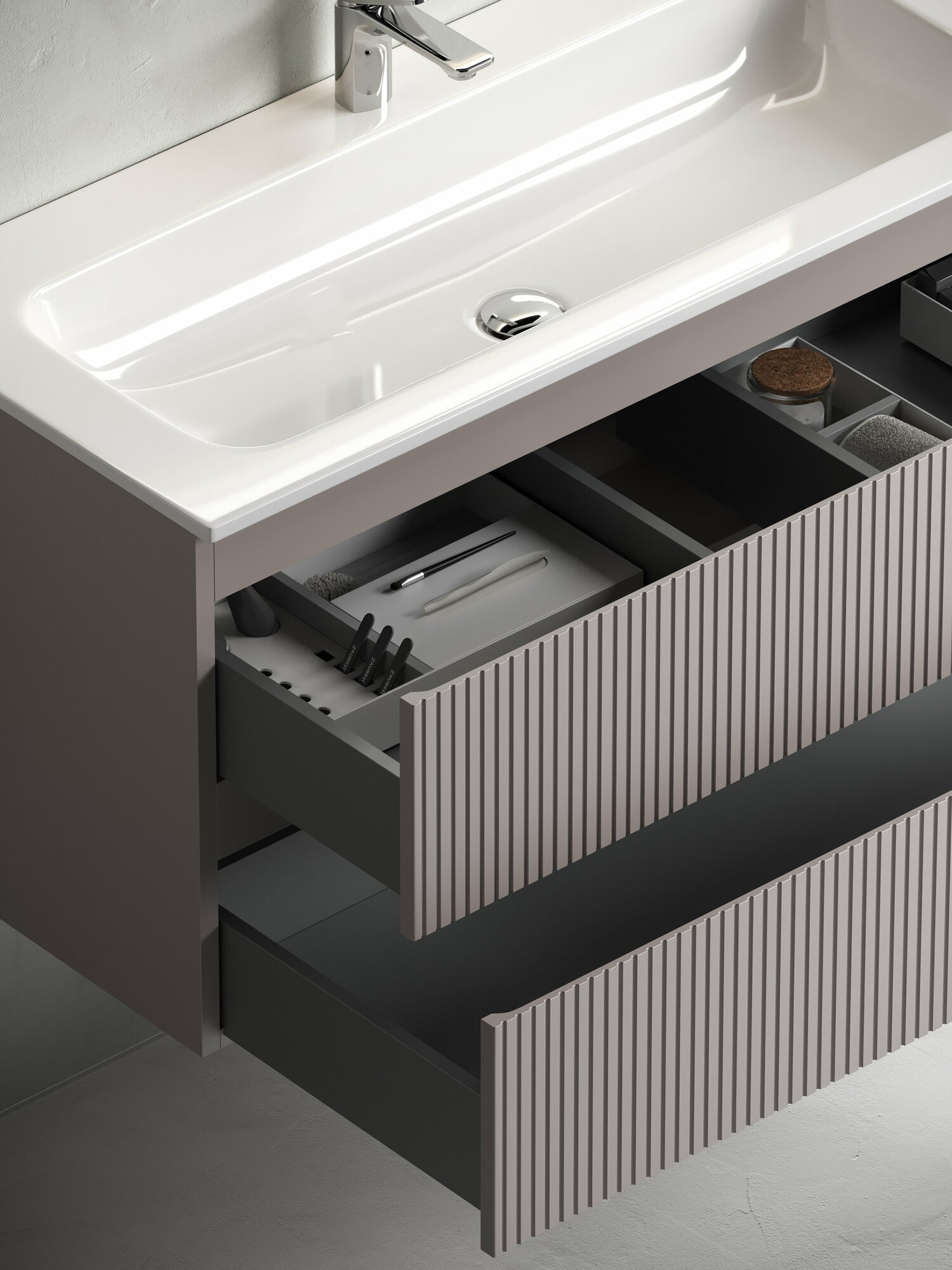 Тумба под раковину Sancos Snob T 100 SNT100SM doha soft c двумя выдвижными ящиками, оснащенными доводчиками. Цвет: Doha soft. Выполнена в современном стиле. Монтаж настенный. Раковина в комплекте не идет. Покрытие корпуса: пленка. Поверхность корпуса матовая. Поверхность фасада матовая. Бельевой корзины в комплекте нет. Страна производства: Италия.