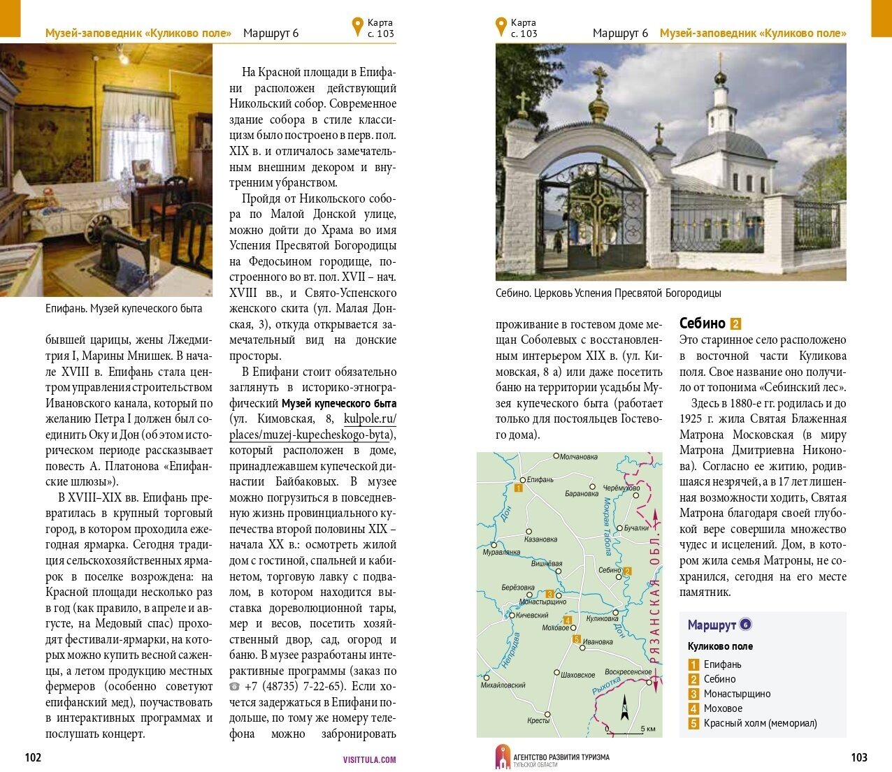 «Хотите понять Россию – начните с Тулы», - говорят сами туляки, зазывая к себе туристов. Эта земля – настоящая сокровищница русской истории, культуры, традиций. Древние крепости и современные музеи, старинные усадьбы и креативные экоотели, истории знаменитых туляков и пейзажи берегов Оки и Красивой Мечи — и все это в относительной близости от Москвы.Тульская земля - родина талантливых писателей, художников, ученых и изобретателей. Про неё писали Лев Толстой и Иван Тургенев, Василий Жуковский и Иван Бунин; ее рисовал Василий Поленов, она вдохновляла композиторов Даргомыжского, Мусоргского, Щедрина, её история связана почти со всем российскими правителями: Иваном IV, Василием Шуйским, Елизаветой Петровной и Екатериной Великой, Александрами, Николаями. Это и знаменитое Куликово поле, и вдохновляющая Ясная Поляна, и пейзажи берегов Оки. Сегодня приехать в регион можно ради посещения таких старинных усадеб, как Ясная Поляна -писателя Льва Толстого, Дворяниново - агронома Андрея Болотова, Поленово - художника Василия Поленова. Нельзя обойти вниманием и родовое поместье Тургеневых, окрестности которого вдохновили Ивана Сергеевича на создание «Записок охотника». Не только ценителям истории, но и всем без исключения, непременно нужно отправиться на Первое ратное поле России – легендарное Куликово поле. О богатой истории Тульского края свидетельствует и старейшее сооружение столицы региона - Тульский кремль. Сегодня это главная достопримечательность, место притяжения туляков и гостей города. Древняя Тула покоряет своим очарованием с первого взгляда. Одна лишь прогулка по её улицам доставляет большое удовольствие. Музеи, храмы, старинные особняки, деревянные дома с наличниками, благоустроенные парки… Путеводитель предлагает 12 авторских маршрутов, каждый из которых нанесён на карту-схему, что поможет туристу сориентироваться. Так что можно не сомневался: каждый сможет подобрать для себя подходящий.