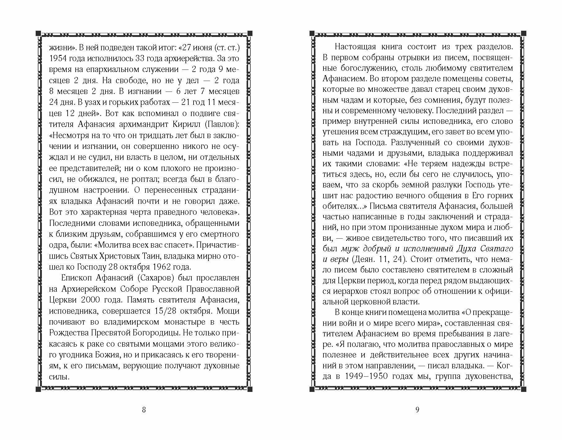 Отрывки, вошедшие в настоящую книгу, взяты из эпистолярного наследия святителя Афанасия, епископа Ковровского, составителя службы Всем русским святым, исповедника веры XX века. Огромная часть жизни владыки прошла в тюрьмах, лагерях и ссылках, во время пребывания в которых он не оставлял вверенную ему паству, поддерживая своих духовных чад молитвой и письмами. Слово святителя Афанасия, безусловно, послужит утешением и современному человеку. В конце книги помещена молитва «О прекращении войн и о мире всего мира», составленная святителем в середине прошлого века.