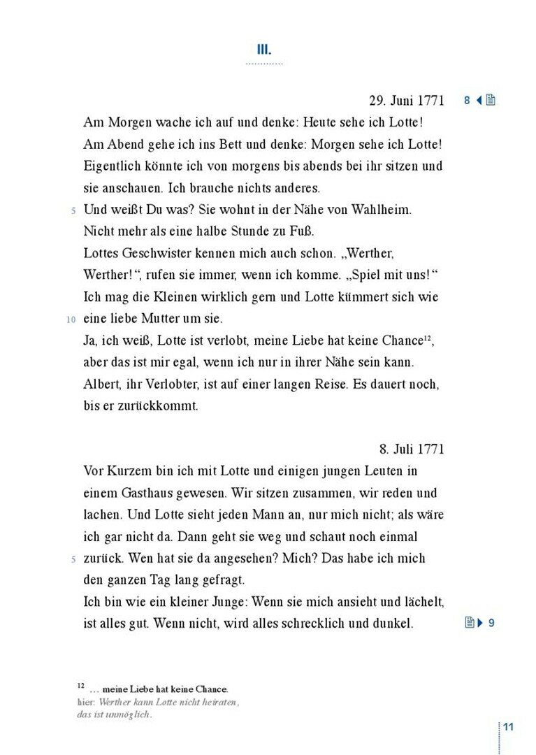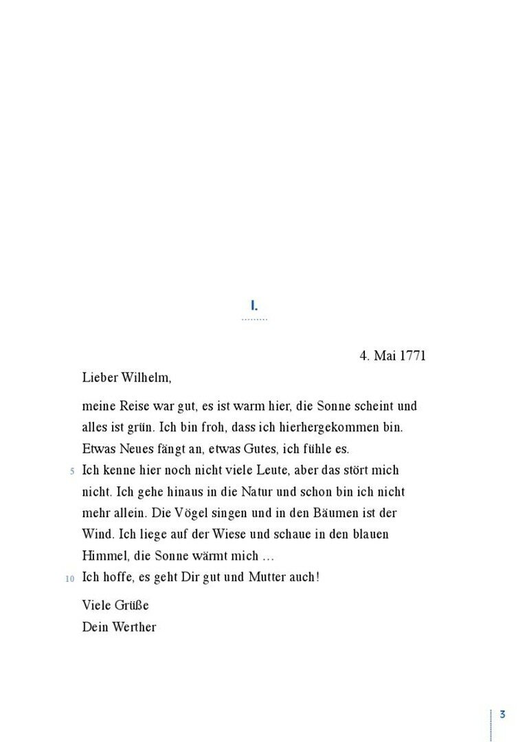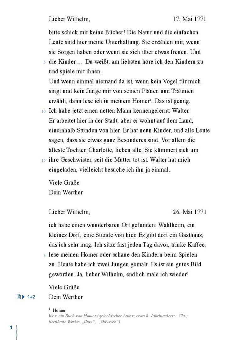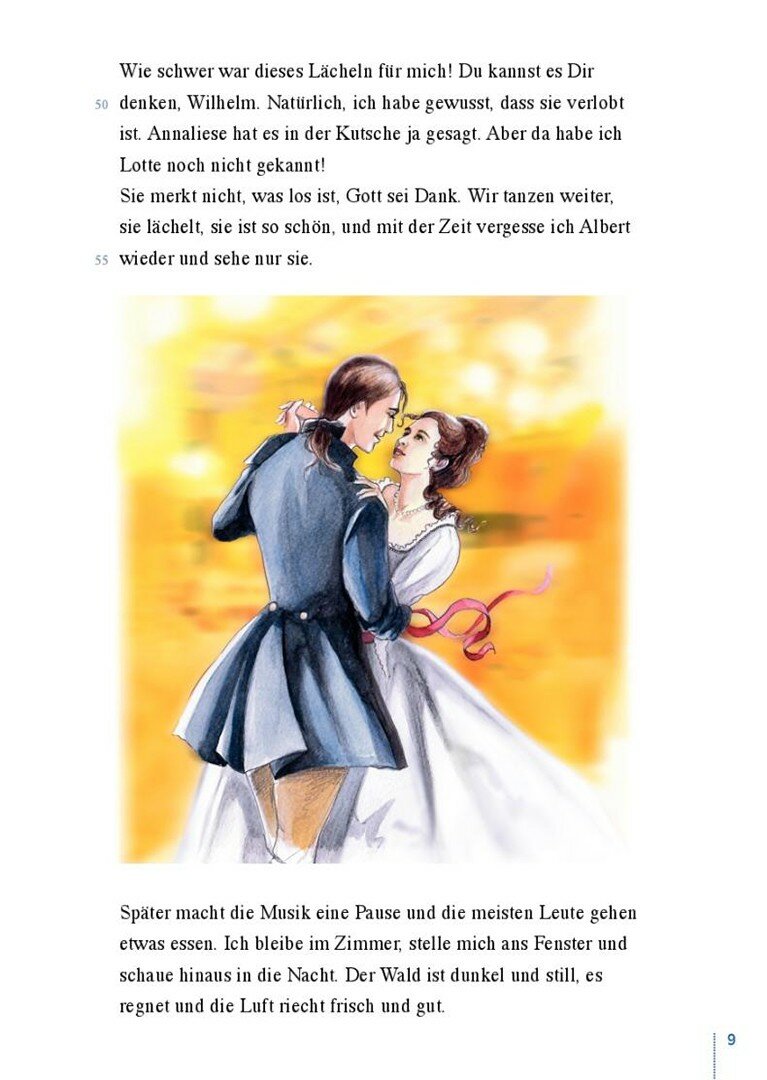 Er schreibt Briefe an seinen Freund Wilhelm und erzahlt von seiner Liebe, seinem Gluck, seiner Trauer und seiner immer tieferen Verzweiflung, dass er nie wirklich mit Lotte zusammen sein kann.