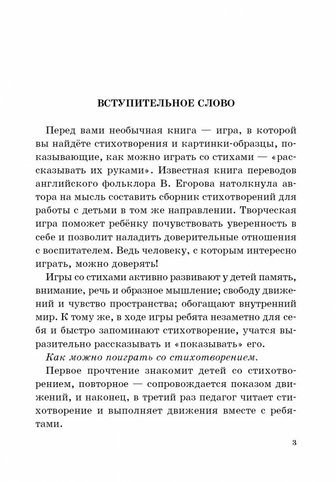 Пособие представляет собой практическое руководство для занятий с детьми 5-7 лет. В книгу включено 40 стихотворений и описана работа с ними по методике "расскажи стихи руками". Целью занятий по данной методике является развитие речи и мелкой моторики (тонких движений пальцев) и координации слова с движением у дошкольников.