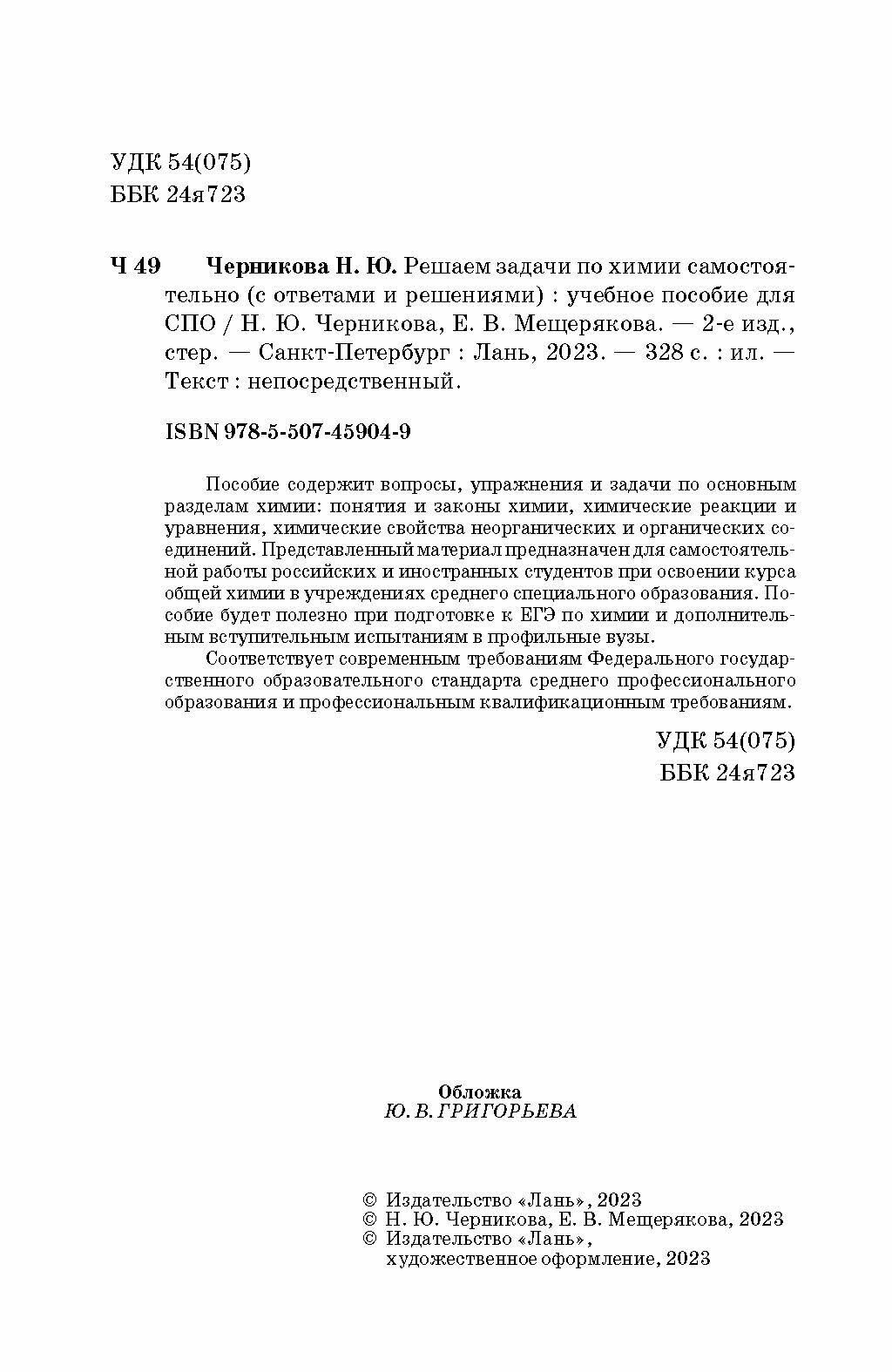 Решаем задачи по химии самостоятельно с ответами и решениями (Черникова Наталья Юрьевна, Мещерякова Елена Владимировна); Лань, 2023