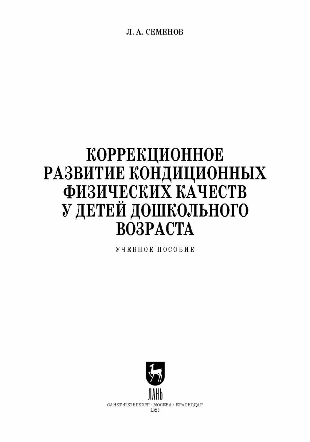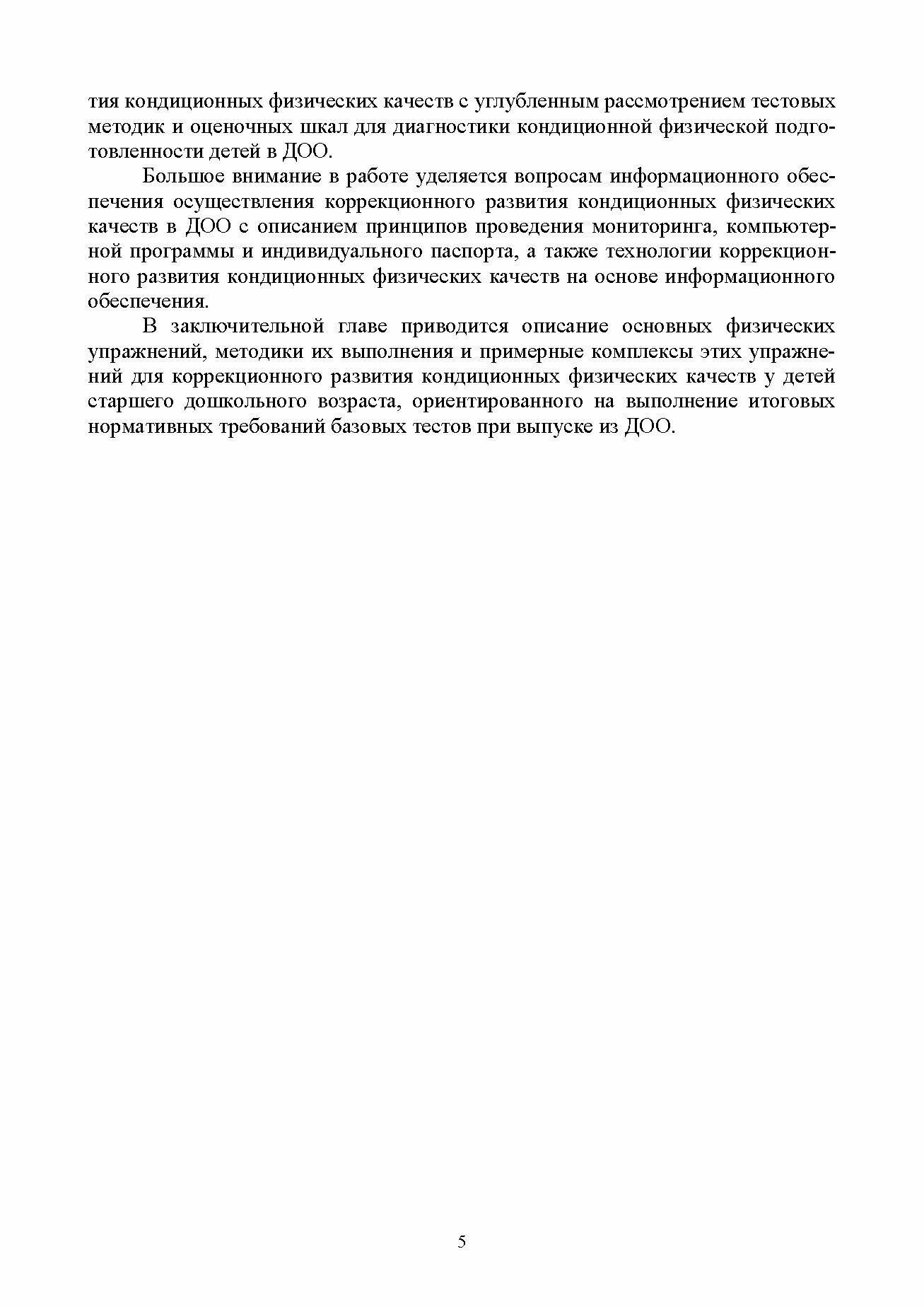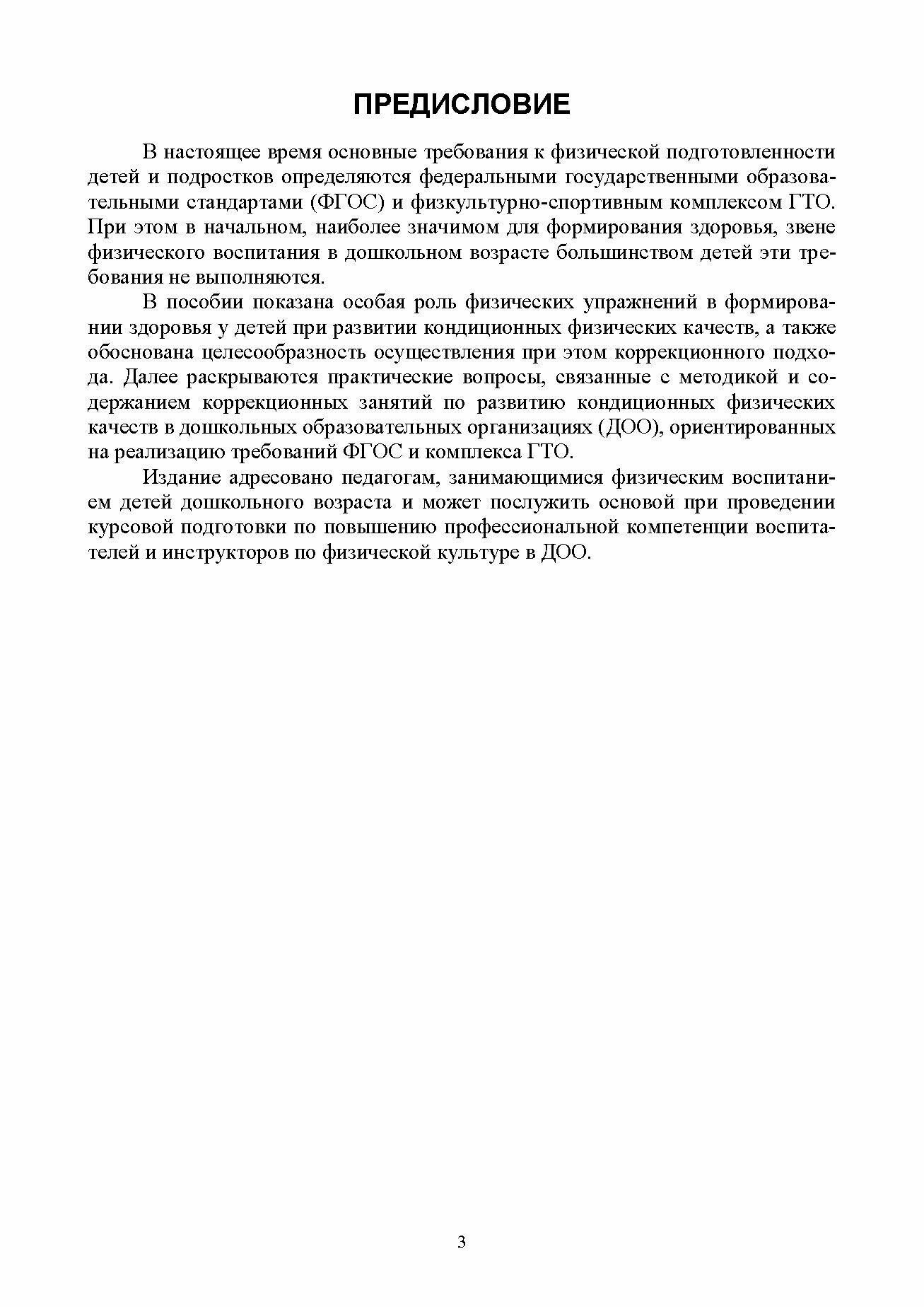 В учебном пособии показана особая роль физических упражнений в формировании здоровья у детей при развитии кондиционных физических качеств, а также обоснована целесообразность осуществления при этом коррекционного подхода. Раскрываются практические вопросы, связанные с методикой и содержанием коррекционных занятий по развитию кондиционных физических качеств в дошкольных образовательных организациях, ориентированных на реализацию требований ФГОС и комплекса ГТО.