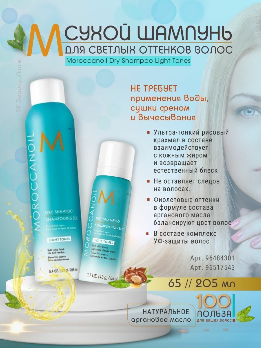 Moroccanoil разработала сухой шампунь в двух вариантах: для светлых волос и для темных волос. Сухой шампунь Moroccanoil для светлых волос содержит мелкий порошок из рисового крахмала, который впитывает жиры, убирает наслоения и неприятный запах, освежает и очищает волосы. Формула фиолетового оттенка с высоким содержанием арганового масла защищает от негативного воздействия ультрафиолетового излучения, помогает восстановить цветовой баланс светлых волос и сохраняет однородность их окраски.