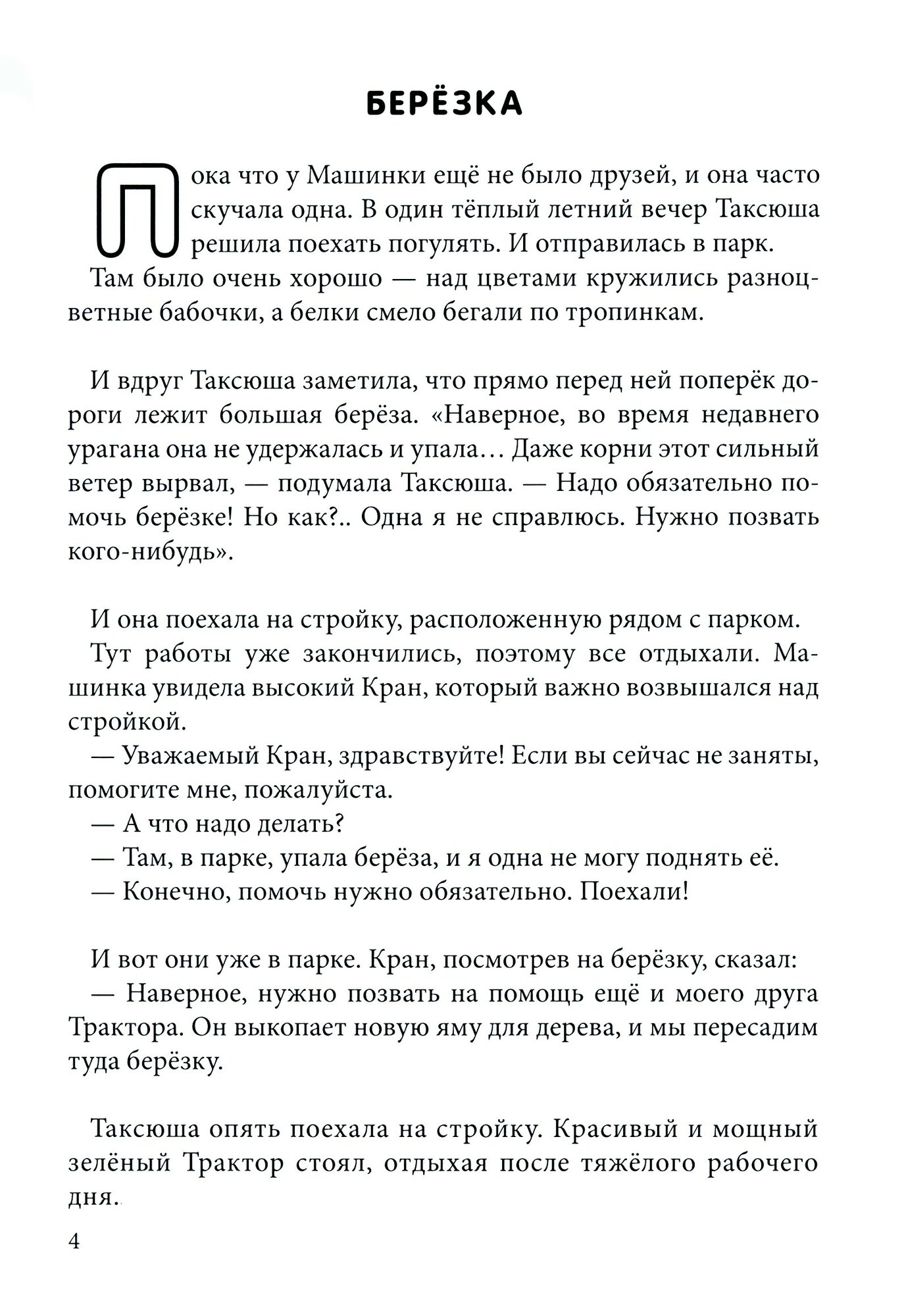 Истории эти произошли в одном замечательном городе, где было много красивых домов и парков. Там жила маленькая жёлтая Машинка. Она была совсем небольшой, но очень сильной и доброй. Работала Машинка в службе такси, отвозила людей туда, куда им было надо. И ещё Машинка очень любила помогать другим, если у них что-то происходило. А звали её - Таксюша.