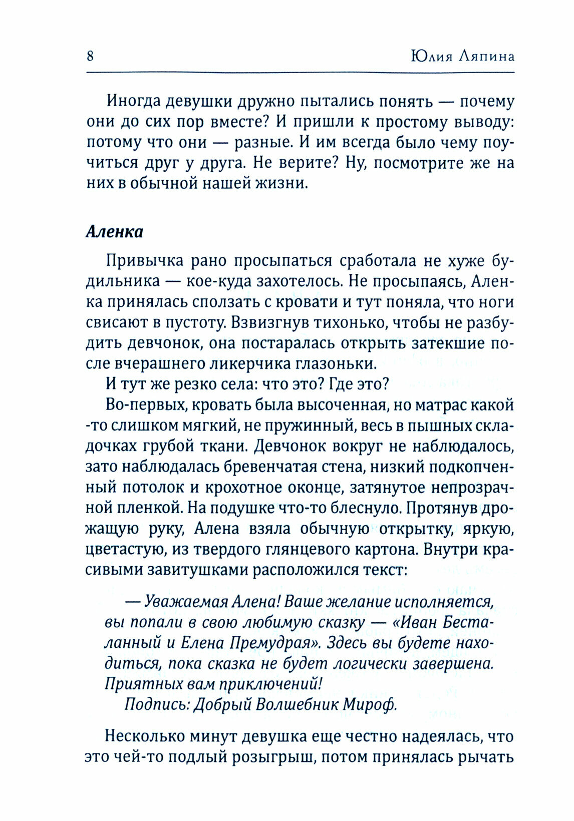 Я сравнительно давно читала эту книги Юлии и помню впечатления, которое она на меня произвела. Добрая история, где есть и человеческие отношения, и дружба, и любовь, и сказочные, но такие важные для каждой героини, перевоплощения. Исцеляющая, мудрая книга, читая которую, начинаешь верить в чудеса. Невольно хочется закрыть глаза в своей спальне, а открыть в самой гуще волшебных событий. Рекомендую принимать как лекарство от печалей и забот. Особо ценю умение автора описывать персонажей: с любовью и вниманием к деталям.