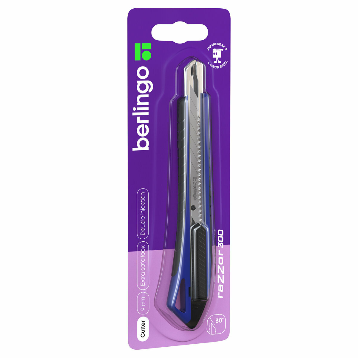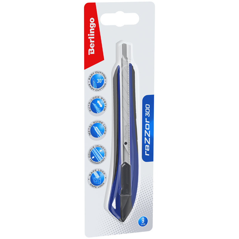 Канцелярский нож Berlingo серии Razzor 300 с автоматической системой фиксации лезвия auto-lock. Комплектуется износостойким лезвием из стали SK5 с углом 30°. Ширина лезвия: 9 мм. Корпус ножа синего цвета выполнен из высококачественного ABS пластика с применением технологии двойного литья (прорезиненные вставки). Имеет металлические направляющие. Индивидуальная упаковка – блистер с европодвесом. На оборотной стороне блистера есть перфорация для более удобного извлечения инструмента из упаковки.