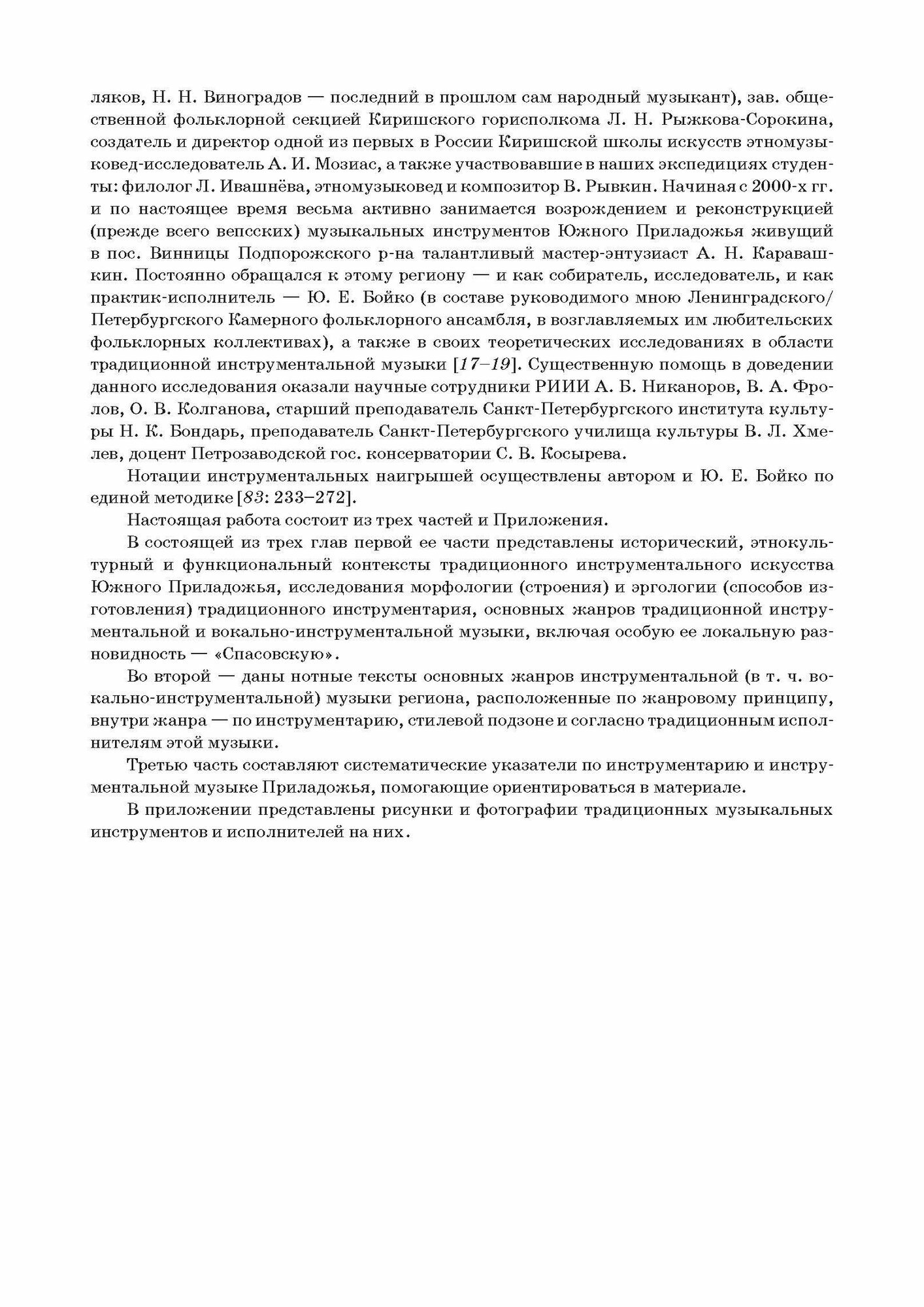 Монография ведущего отечественного этномузыколога и композитора, признанного главы Санкт-Петербургской и Евразийской школы современного инструментоведения И. В. Мациевского дает полноценное представление об инструментальной музыкальной культуре одного из интереснейших и своеобразных регионов русского Севера — Южного Приладожья — исторического форпоста Российской государственности.