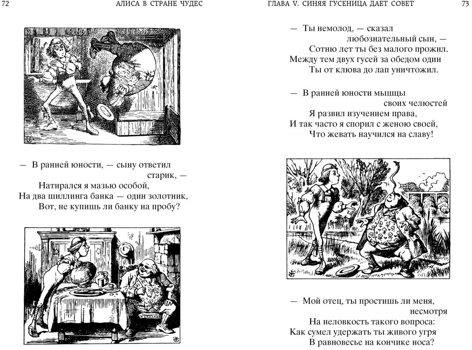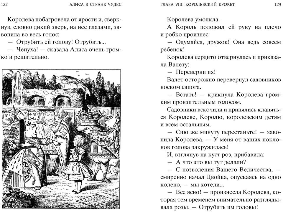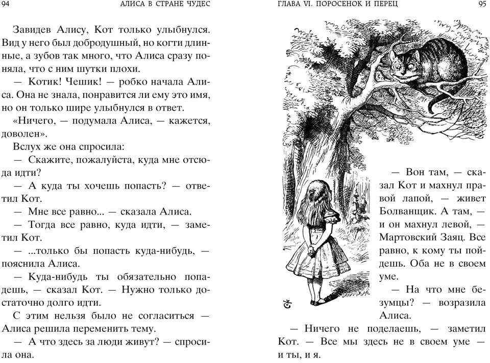 Эта дилогия про девочку Алису принадлежит к той, очень редкой надо сказать породе, что со временем меняет свой возрастной ценз в большую сторону. Обычно, произведения при первой публикации, рассчитанные на взрослую аудиторию, в течение лет превращаются в подростковые, а то и детские (такого много: рассказы о Холмсе, путешествия Верна &ect). С \"Алисой в стране Чудес\" все сложнее. Небольшие повести Кэрролл наполнил парадоксальными силлогизмами, интеллектуальными шутками и словесной игрой, до такой степени, что не каждый взрослый справится без комментариев. Так что вопреки остальным восторженным отзывам, читать Кэрролла рекомендовал бы не раньше выпускных классов школы, а до того есть прекрасные адаптации повестей для игрового кино и мультипликации. -