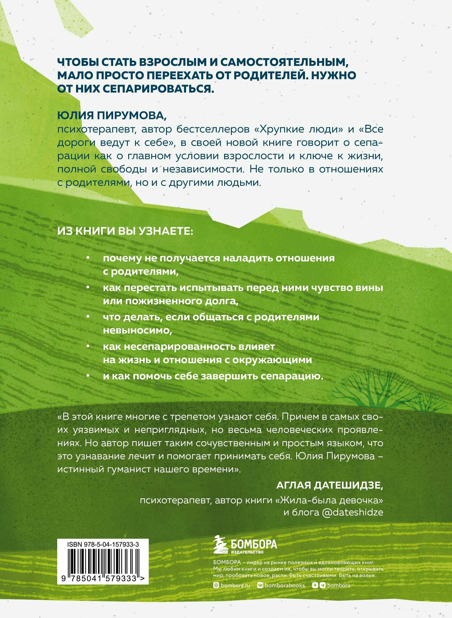 Юлия Пирумова, психотерапевт, автор бестселлеров «Хрупкие люди» и «Все дороги ведут к себе», в своей новой книге говорит о сепарации — как о главном условии взрослости и ключе к жизни, полной свободы и независимости. Не только в отношениях с родителями, но и с другими людьми.