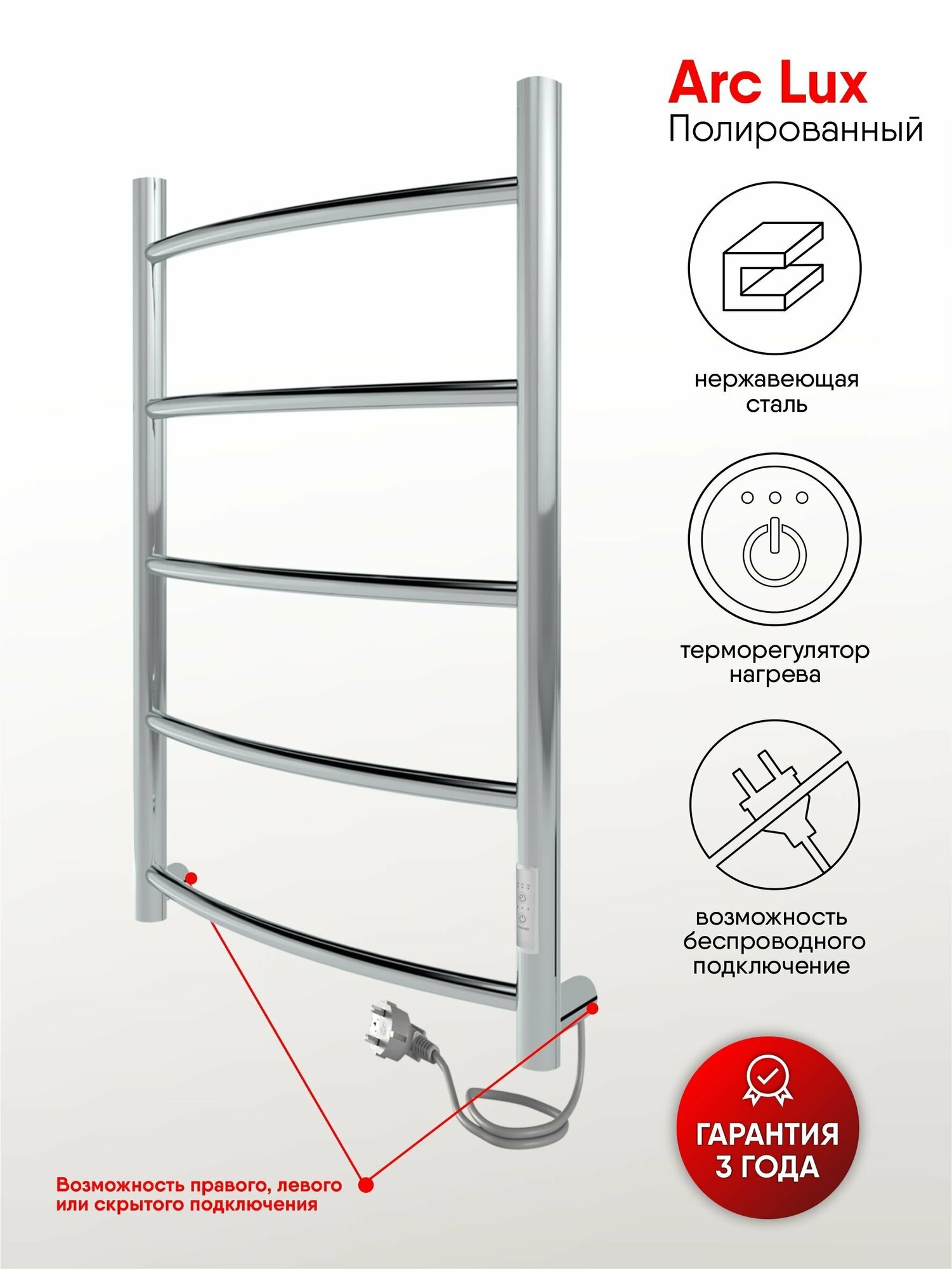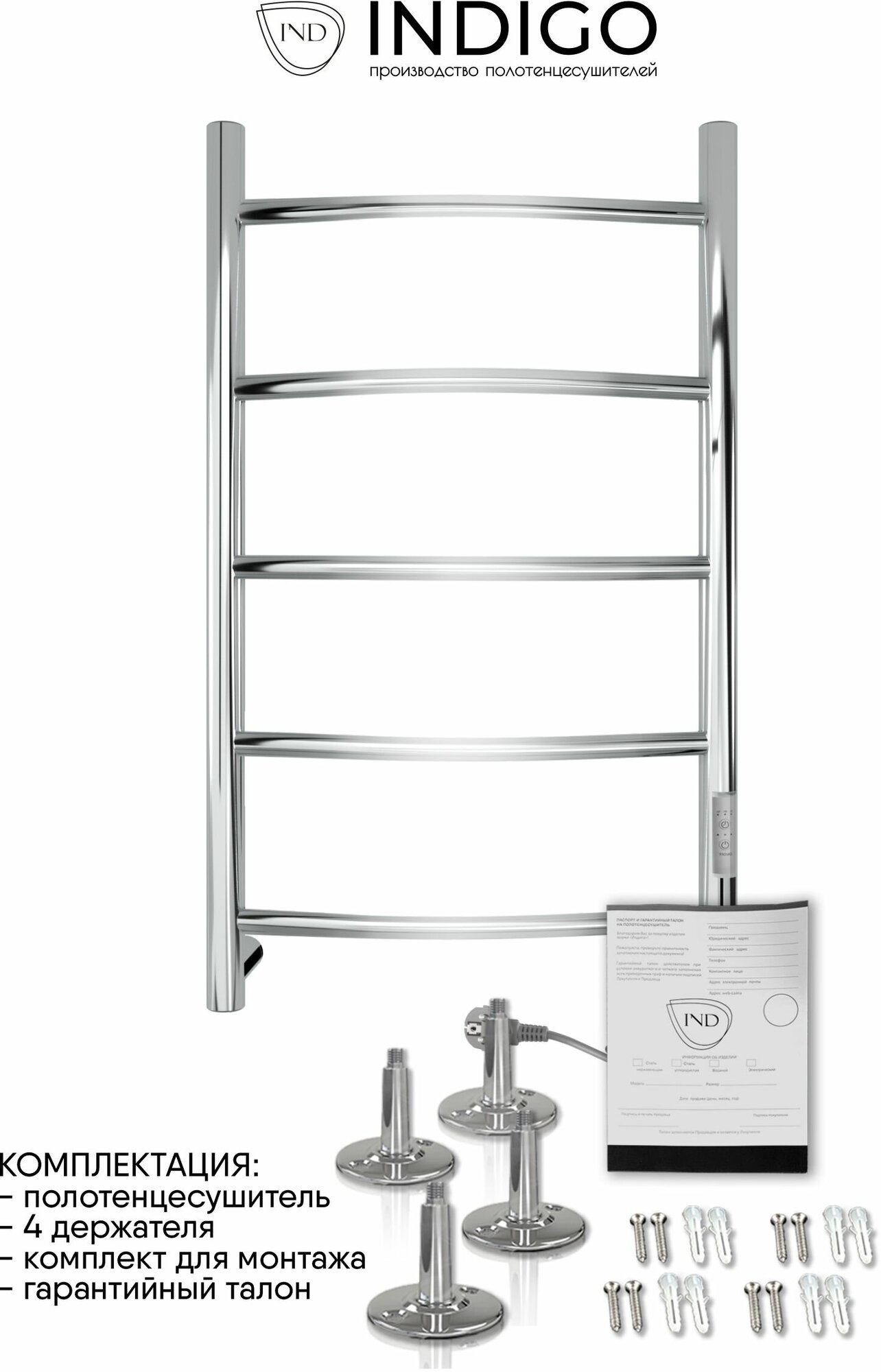 Полотенцесушитель электрический INDIGO Arc Lux с терморегулятором (таймером) создаст комфортную температуру в ванной комнате. С ним полотенца будут теплыми и сухими. Форма - лесенка дуга. Высота - 800 мм, ширина - 400 мм, глубина с держателями - 106 мм. Расстояние между перекладин 17 см. Изделие выполнено из круглой трубы. Материал изделия - это полированная нержавеющая сталь AISI304 толщиной 2 мм c высокими антикоррозийными свойствами. Сталь гармонично сочетается с остальной сантехникой цвета хром. Благодаря мягким классическим формам электрополотенцесушитель прекрасно впишется в интерьер душевой комнаты, прихожей, гардеробной или балкона. Мощность — 70 Вт. При постоянной работе устройство потребляет энергии не больше лампочки. Панель управления находится на правой части стойки. Регулятор нагрева имеет три режима - 40, 45, 50 градусов, а таймер можно настроить на отключение через 2, 4, 6 часов. Включать сушилку настенную можно по необходимости, но создана она для круглосуточной работы. Класс защиты IP44 гарантирует безопасность использования во влажной среде и защиту от брызг, а надёжная гидроизоляция и грамотно рассчитанное сечение нагревательного элемента не дают изделию перегреваться. Нагревательный кабель "сухой ТЭН" установлен по всей длине металлического корпуса. Поверхность нагревается в течение получаса до максимума в 55°С. Подключение осуществляется двумя способами: скрытое подключение к электропроводке через модуль скрытого подключения в стену или прямым электропроводом длиной 1,1 метра в розетку. Модуль скрытого монтажа уже в сборе. Провод с вилкой легко переставляется на необходимую сторону, благодаря наличию клемм в обеих частях стойки. Электрический змеевик, в отличие от водяного, никогда не протечёт, не подвержен коррозии блуждающих токов, не зависит от отопительных сезонов и наличия горячего водоснабжения. Для простоты установки полотенцесушитель для белья настенный полностью укомплектована. В комплектацию входят: 4 телескопических держателя, компенсирующие неровности стен, комплект монтажа (дюбели и саморезы), электрошнур с вилкой, инструкция с гарантийным талоном на 3 года. Срок службы изделия не ограничен. Для безопасной транспортировки прибор упаковывается в полиэтилен и пятислойную картонную коробку. Ассортимент интернет-магазина сантехники IND (INDIGO) насчитывает 300+ моделей в 9 цветах и различных размерах. Выбирая INDIGO вы получаете надежный продукт с гарантией качества Российского производителя.