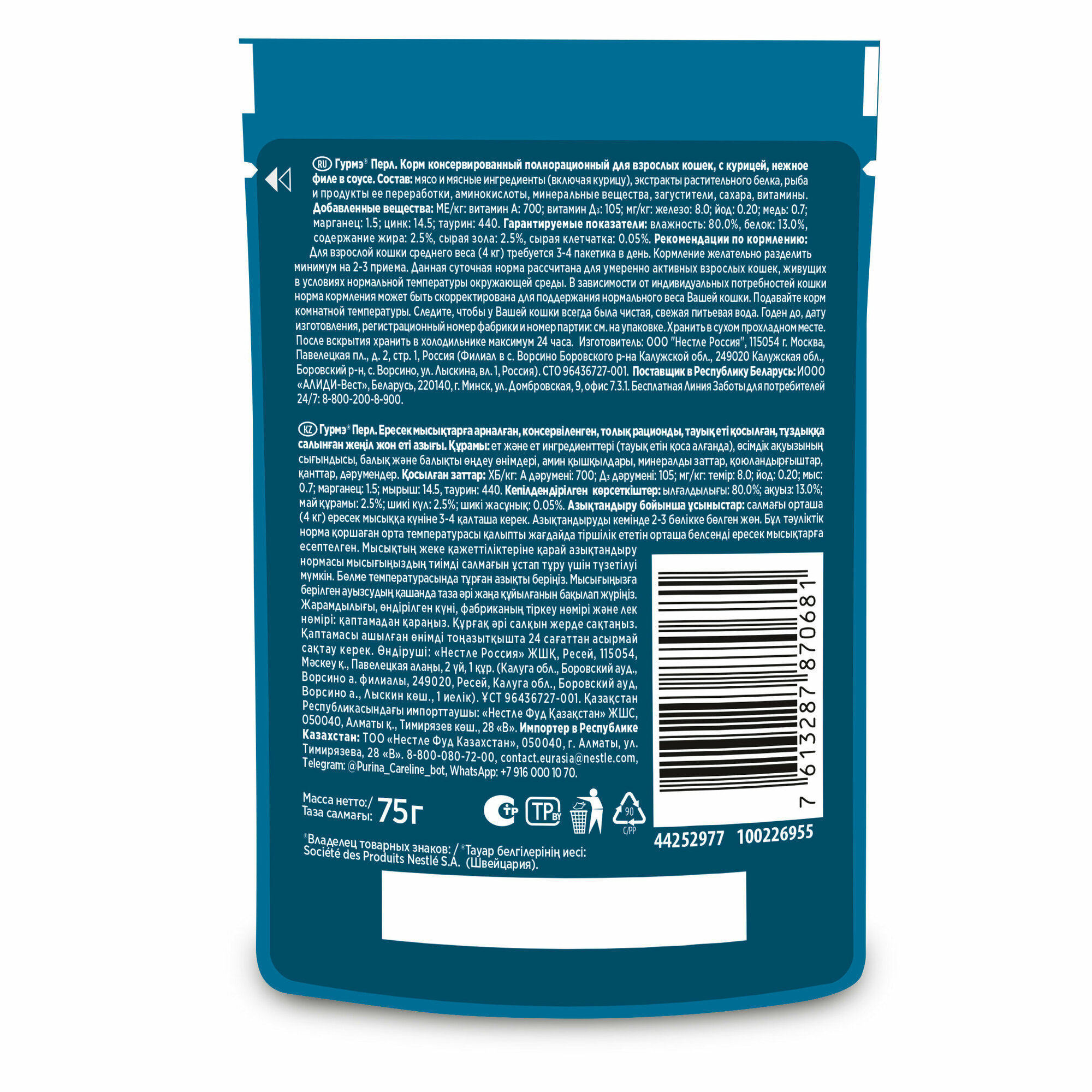 Влажный корм Gourmet Перл Нежное филе для кошек, с курицей в соусе, Пауч, 75г. Эксперты Purina приготовили для кошек с избирательными предпочтениями коллекцию блюд-шедевров Гурмэ Перл с разнообразием вкусов, ароматов и текстур на каждый день. Корм для взрослых питомцев «Перл Нежное филе» — это вкуснейшие бережно приготовленные нежные кусочки в аппетитном соусе. Корм для кошек от Gourmet полнорационный, содержит все необходимые для здоровья микронутриенты. Влажный корм с богатой вкусовой палитрой не оставит равнодушным Вашего взыскательного гурмана. • Комбинация белков и углеводов обеспечивает энергией. • Восхитительное разнообразие вкусов: нежное филе с говядиной, лососем, уткой, индейкой, ягненком или кроликом • Клетчатка благотворно влияет на работу пищеварительной системы. • Влажные корма Gourmet не содержат искусственных ароматизаторов и консервантов.