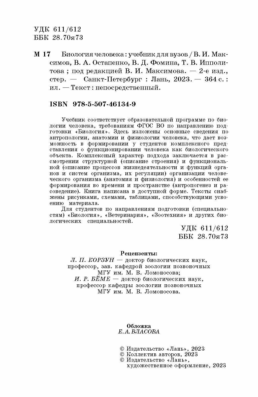 Биология человека. Учебник для вузов (Максимов Владимир Ильич, Остапенко Владимир Алексеевич, Фомина Вера Даниловна); Лань, 2015