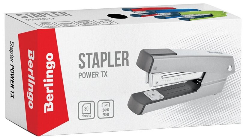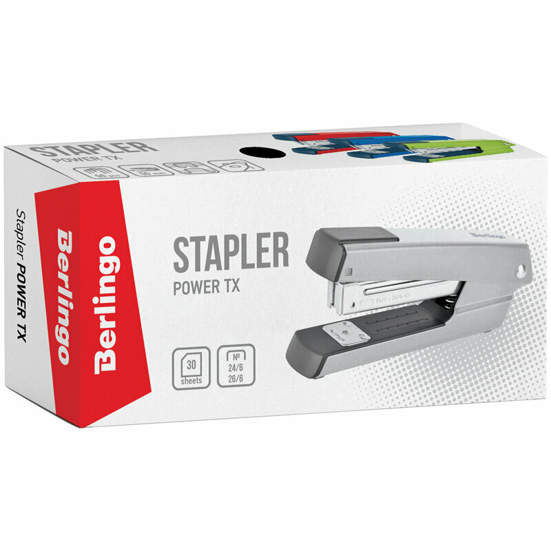 Яркий канцелярский степлер Berlingo Power TX прекрасно подходит для ежедневного использования на рабочем месте. Степлер вмещает 50 скоб размером №24/6, 26/6, имеет 2 типа скрепления. Сшивает до 30 листов. Глубина захвата – 50 мм. Степлер оснащён встроенным антистеплером.