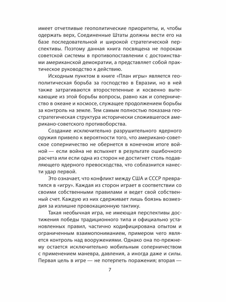 Книга "План игры" была написана на пике противостояния США и СССР. С точки зрения Бжезинского, американо-советское соперничество - "борьба не только двух стран. Это борьба империй". Он подробно анализирует характер и причины "русской территориальной экспансии", пытается сравнить "две империи" и дать определение "великоросского имперского сознания". Автор завершает свою книгу призывом "превзойти СССР исторически", вкладывая в это понятие "ослабление внешнеполитического имперского импульса" и даже "распад советской империи".