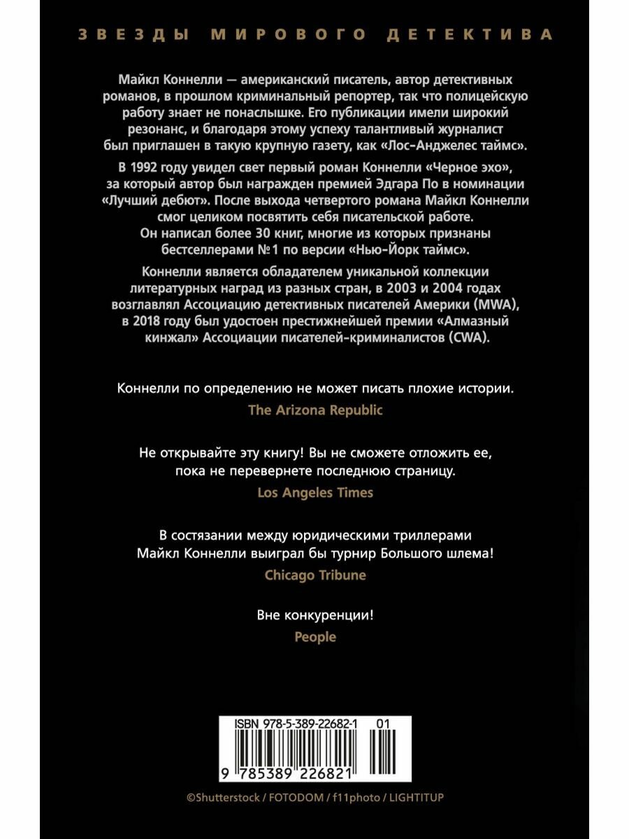 Отличный полицейский детектив , своего рода исследование на тему человеческой жадности и манипулирования людьми. В книге по настоящему крутой сюжет , реалистичный , с резкими поворотами , порой мрачный и безжалостный. Харизматичный детектив Гарри Босх ведёт расследование , в котором каждый неверный шаг может стать для него последним. Следить за происходящим интересно , интрига присутствует до самой развязки.