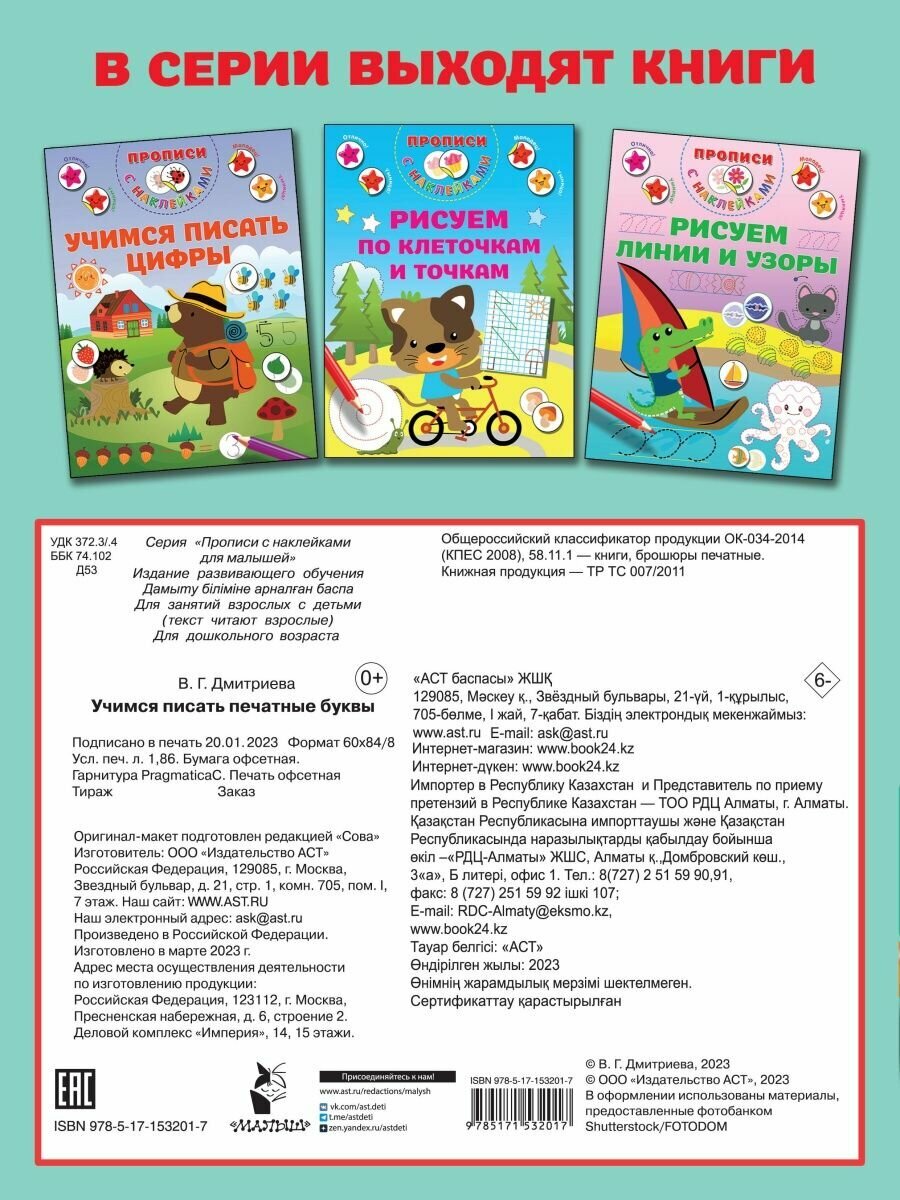 Учимся писать печатные буквы (Дмитриева Валентина Геннадьевна); Сова. Малыш (Обучающая и развивающая литература), 2023