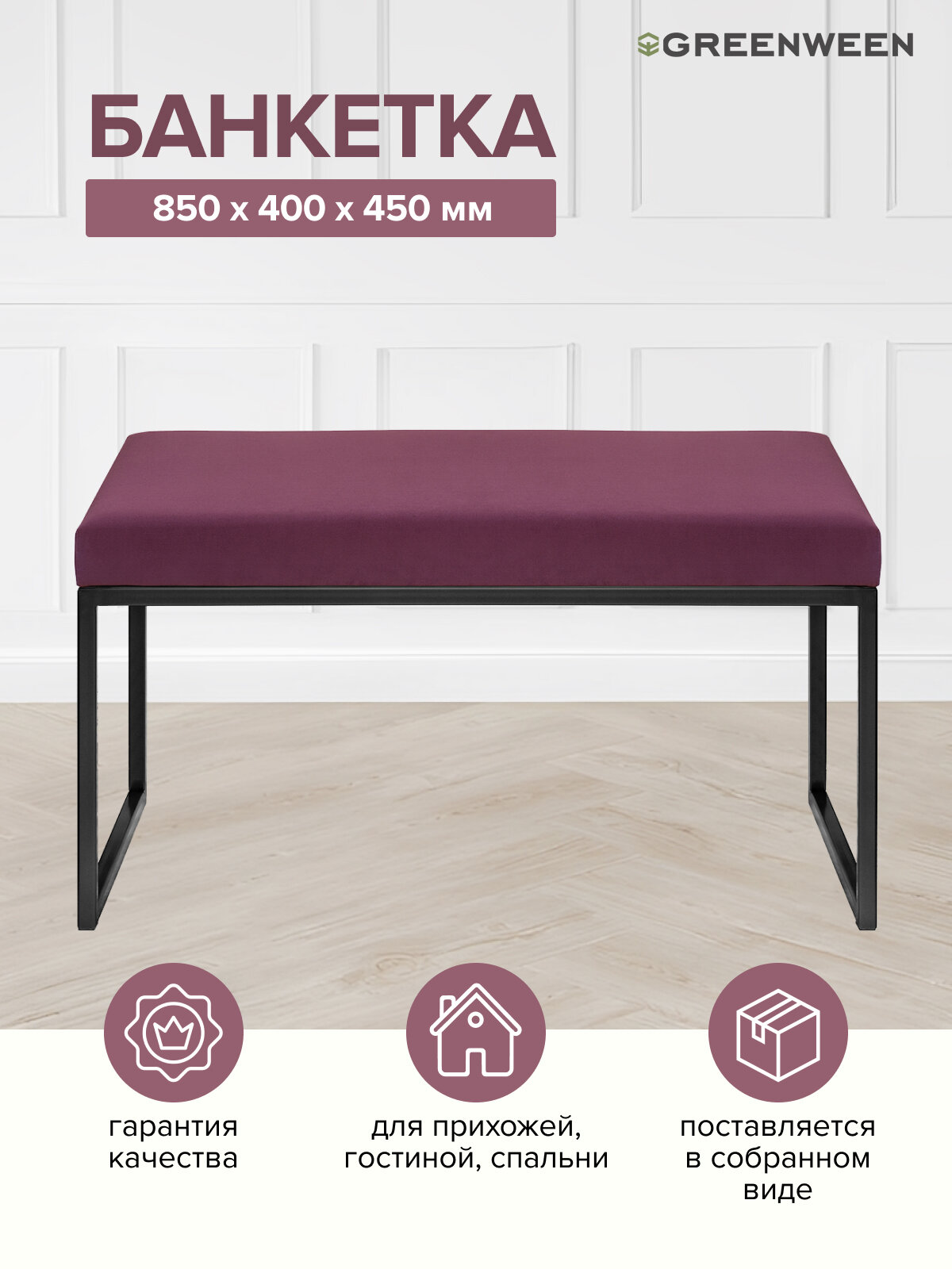 Банкетка ALBA MINI с черным основанием и мягкой велюровой подушкой. Характеристики банкетки ALBA MINI:• размеры: (длина х ширина х высота) 850 х 400 х 450 мм,• вес – 8,7 кг,• высота подушки — 80 мм,• обивка — искусственный велюр, • наполнитель — пенополиуретан,• максимальная нагрузка — 120 кг.Основание банкетки изготовлено из стали с полимерным покрытием. Стальной каркас изготовлен из профильной трубы 20х20 мм. Собственное производство обеспечивает надежность и эстетику сварных швов металлической мебели.Банкетка с велюровой подушкой отличается элегантным видом и комфортной посадкой. Мягкая обивка с высокой износостойкостью, прошла тест Мартиндейла — 35 000 циклов.Бархатистая ткань легко чистится от загрязнений, для ухода разрешена сухая и влажная чистка. Стильная банкетка подойдет для прихожей, спальни, гостиной и кабинета.Банкетка лофт добавит изысканности интерьеру квартиры, офиса, салона и загородного дома. Банкетка отлично сочетается со стеллажами KARIN и пуфами OMEGA.Банкетку доставляем в собранном виде в надежной упаковке.