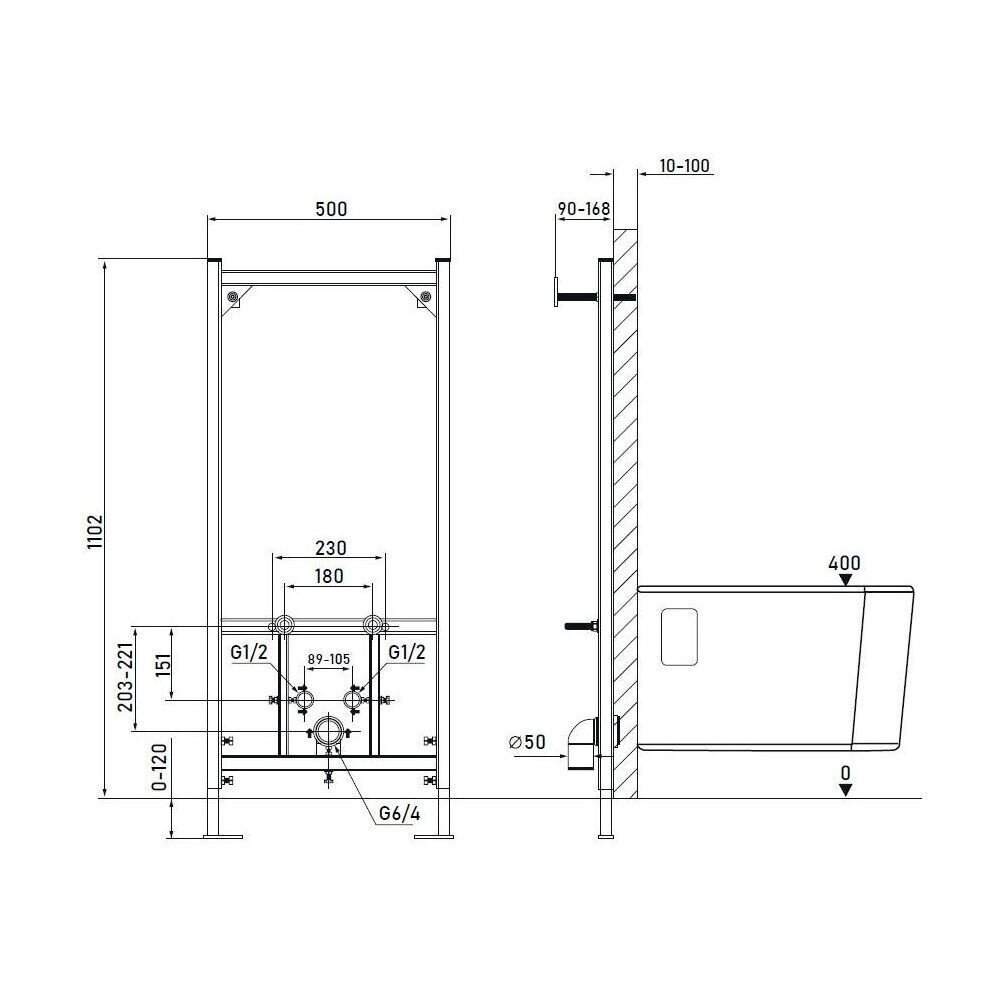 Размер: 1102-1222х500 мм. Размер от монтажной стены до чернового обрамления: 90-168мм. Материал: Сталь. Протестированная нагрузка: до 400 кг. Фитинги.