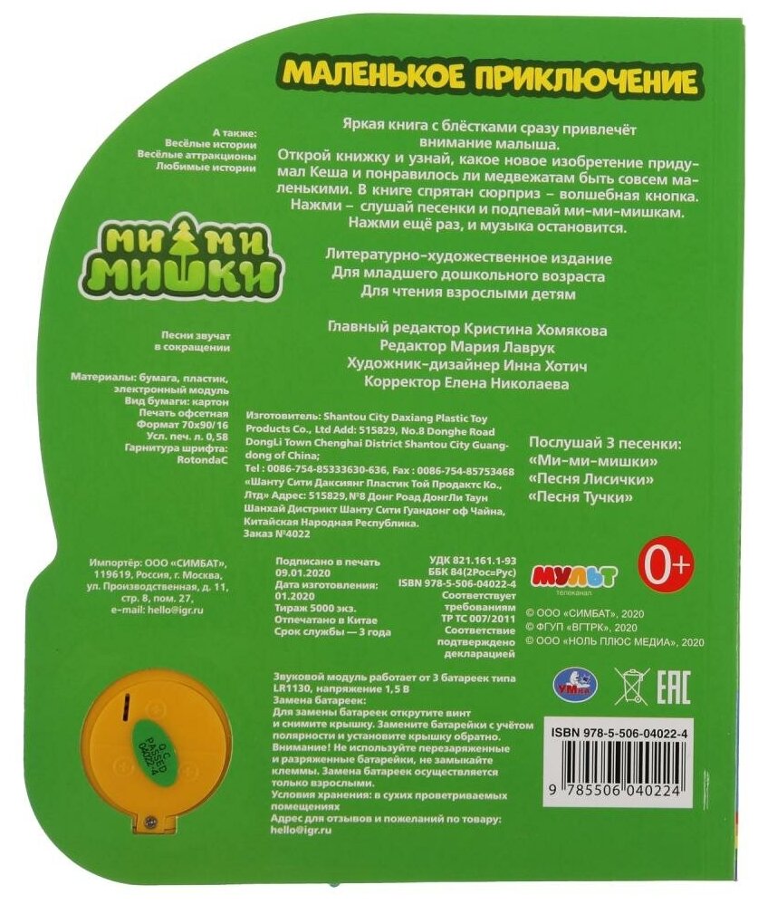 Ребёнок с удовольствием будет листать плотные страницы, рассматривать красочные картинки, читать вместе с родителями про приключения любимых персонажей, а также нажимать на кнопку и слушать весёлые песенки. Малыш легко освоит включение звука: по нажатию на кнопку включится первая песенка, при втором нажатии выключится, в 3-ий раз - заиграет следующая и т.д. Благодаря компактному формату книгу удобно взять с собой в дорогу.