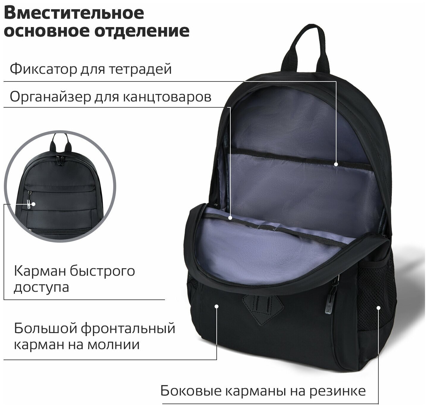 Для подкладки используется прочный, устойчивый к воздействию загрязнений, полиэстер. Плотная вентилируемая спинка рюкзака обеспечивает удобное прилегание к спине, способствуя равномерному распределению нагрузки, делая эту модель комфортной и безопасной для ежедневного использования.