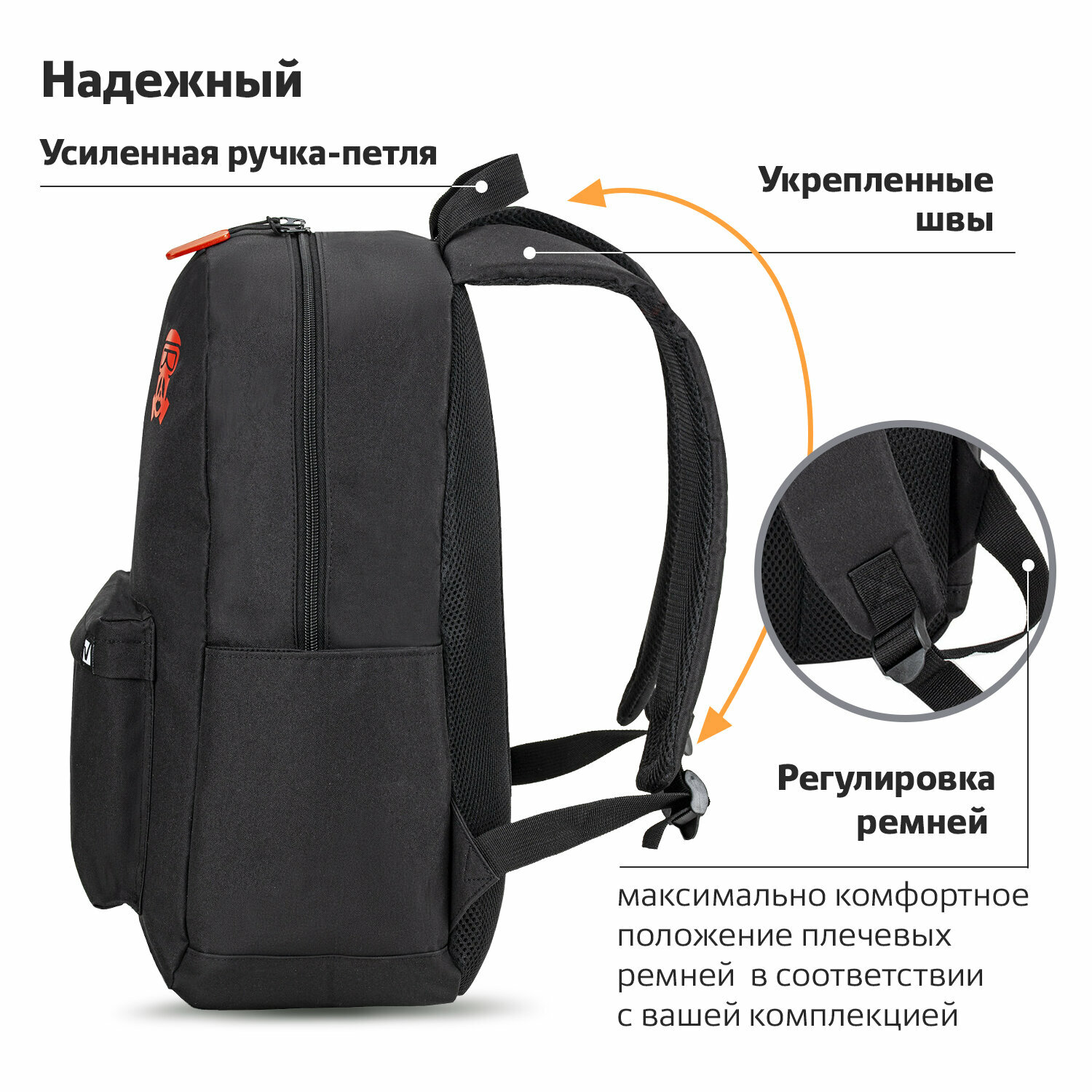 Дно рюкзака уплотнено толстым слоем специальной амортизирующей пены. Рюкзак легко открывать и закрывать одной рукой с любой стороны — основное отделение имеет долговечную молнию с удобными и яркими бегунками. Для переноски рюкзака и для подвешивания на крючок можно использовать прочную ручку-петлю.