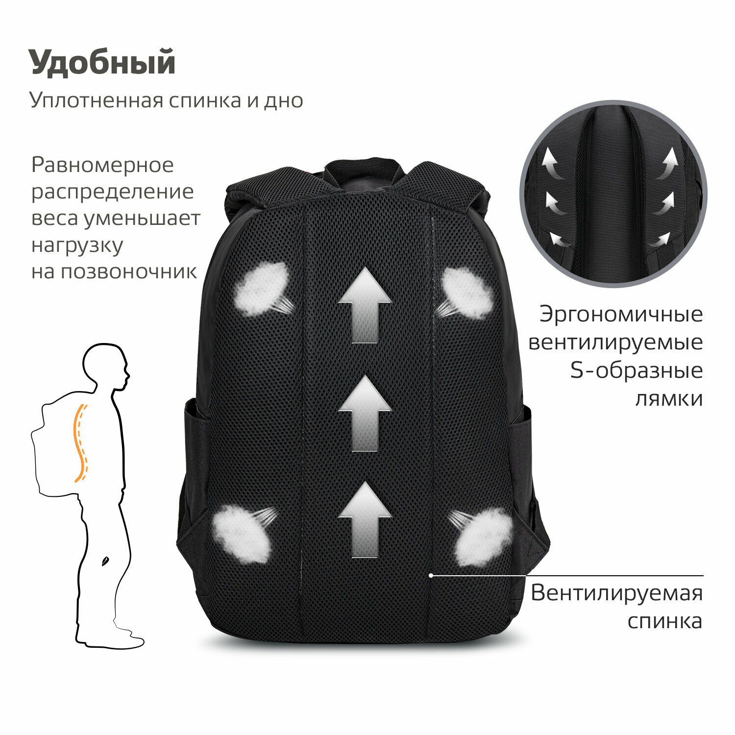 Широкие эргономичные S-образные плечевые ремни анатомической формы оснащены мягкой, пропускающей воздух набивной подкладкой, способствуя удобной носке. Удобная регулировка длины производится с помощью пряжек, выполненных из качественного пластика. Дополнительные швы надежно фиксируют лямки в верхней и нижней части рюкзака.