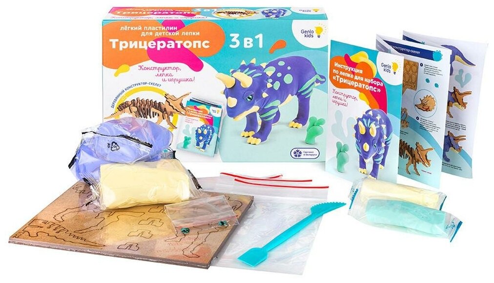 В набор "Трицератопс" входит легкий пластилин разных цветов и детали для сборки скелета трицератопса из деревянных деталей. Следуя инструкции набора, можно получить фигурку этого удивительного создания, жившего на нашей планете за долгие годы до появления человека.