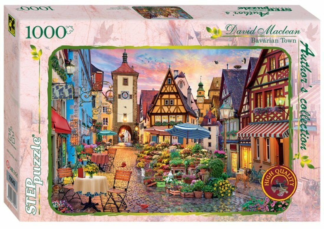 Пазл «Баварский городок» относится к авторской коллекции. Картина принадлежит кисти Дэвида Маклина. Тут мы видим интересный городской пейзаж: узкую улочка, типичную для тех краев архитектуру и клумбу с цветами.