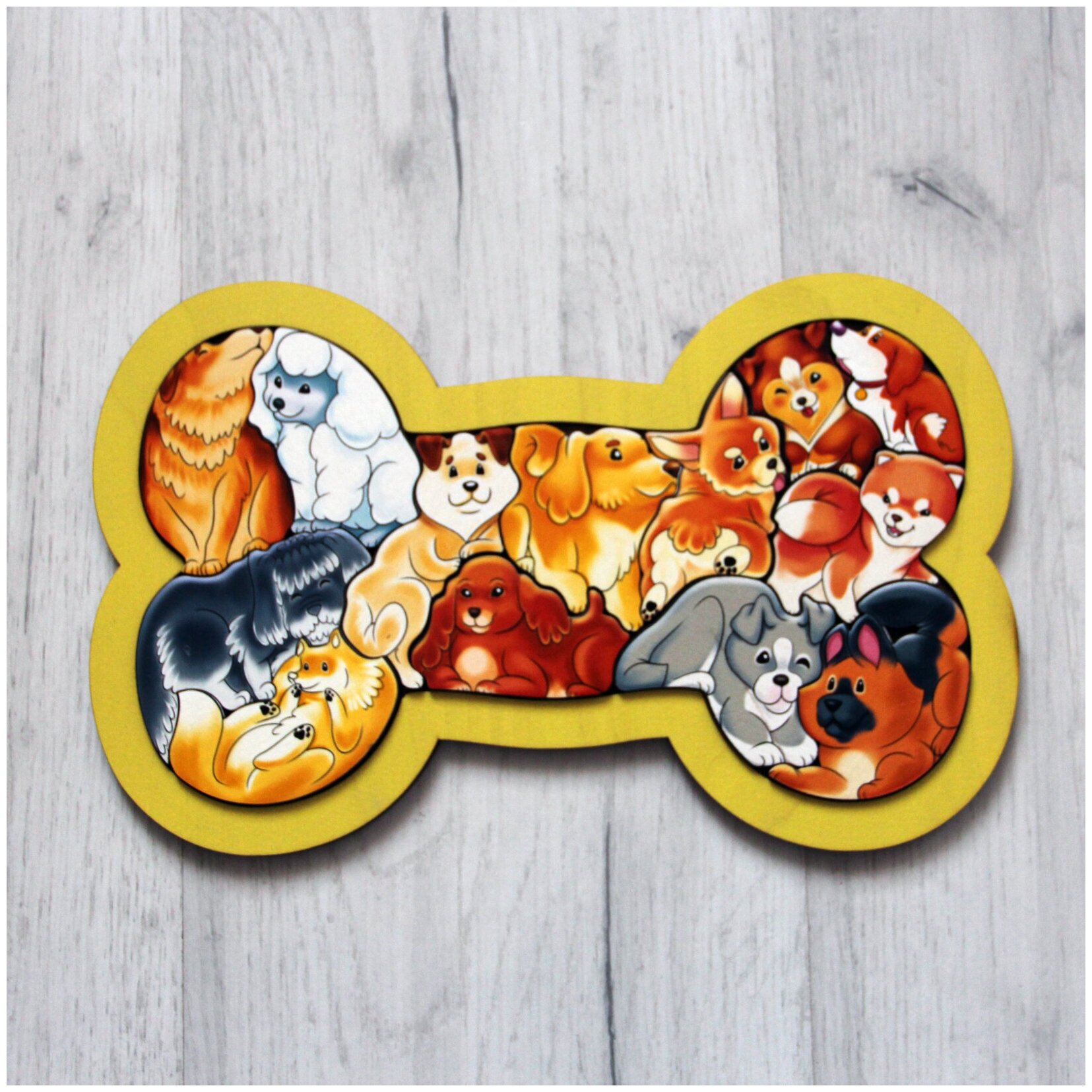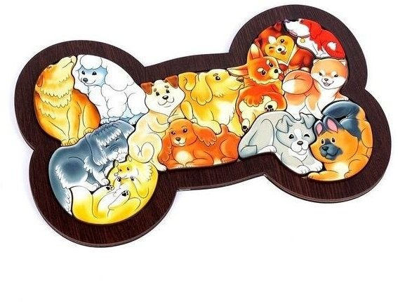 Деревянный пазл головоломка. В наборе 13 фигурок собак, которые нужно расположить на поле. На входящем в набор вкладыше приведена картинка укладки фигурок. Сначала можно предложить ребенку собирать пазл по образцу, а затем по памяти. Состав: игровое поле 18х28 см, 13 фигурок.